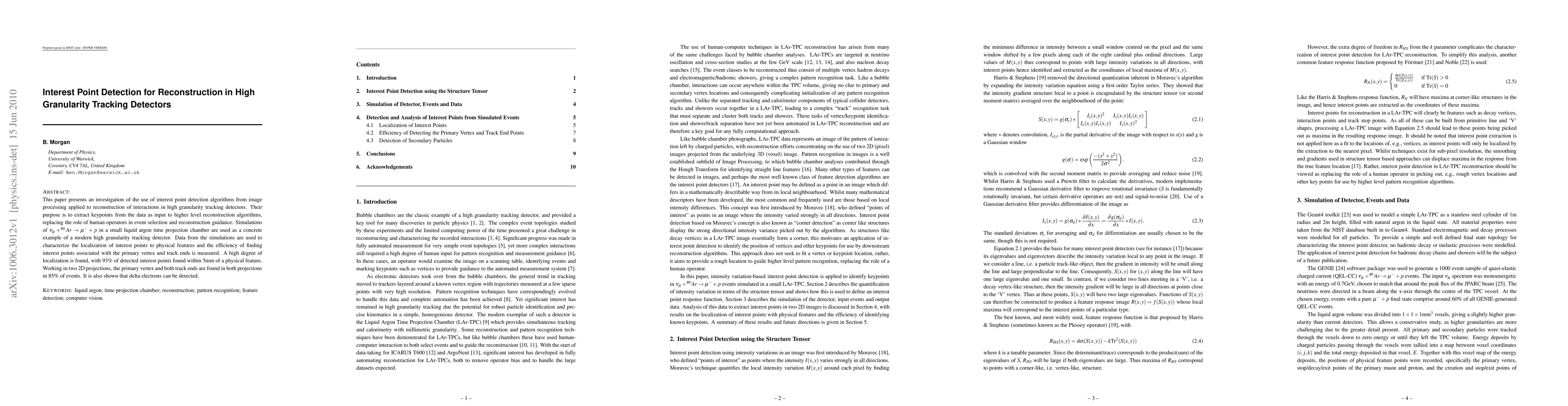 This paper presents an investigation of the use of interest point detection algorithms from image processing applied to reconstruction of interactions in high granularity tracking detectors. Their purpose is to extract keypoints from the data as input to higher level reconstruction algorithms, replacing the role of human operators in event selection and reconstruction guidance. Simulations of nu_mu charged current events in a small liquid argon time projection chamber are used as a concrete example of a modern high granularity tracking detector. Data from the simulations are used to characterize the localization of interest points to physical features and the efficiency of finding interest points associated with the primary vertex and track ends is measured. A high degree of localization is found, with 93% of detected interest points found within 5mm of a physical feature. Working in two 2D projections, the primary vertex and both track ends are found in both projections in 85% of events. It is also shown that delta electrons can be detected.