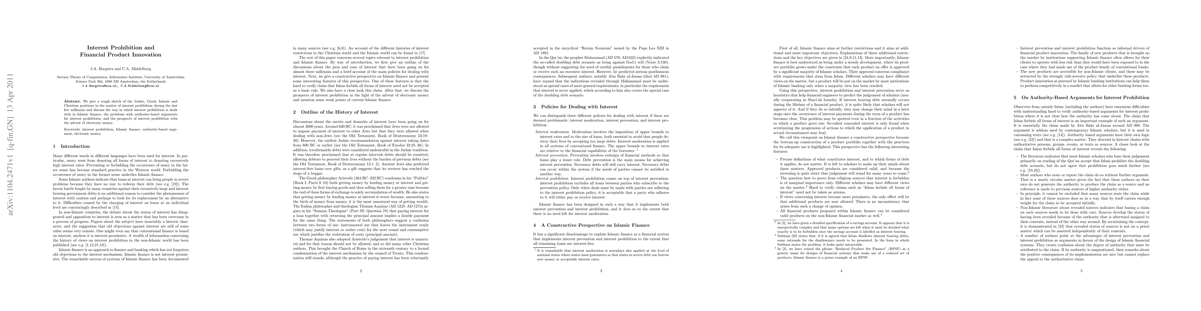 This paper explores historical perspectives on interest prohibition across various cultures and religions, focusing on Islamic finance, and examines the challenges of traditional arguments against interest. It also considers the potential impact of electronic money on interest prohibition trends.
