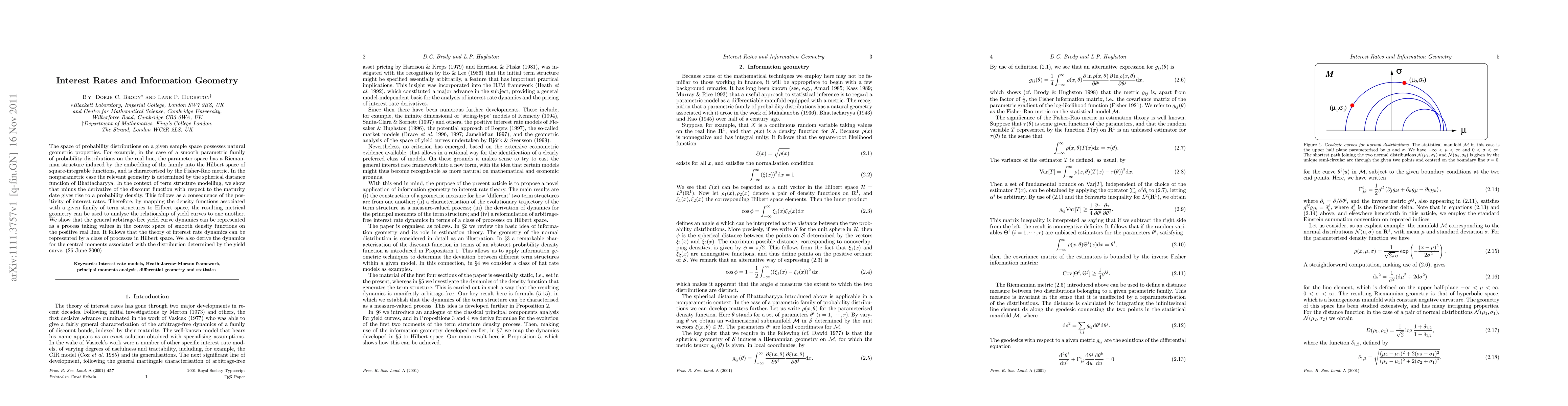 The space of probability distributions on a given sample space possesses natural geometric properties. For example, in the case of a smooth parametric family of probability distributions on the real line, the parameter space has a Riemannian structure induced by the embedding of the family into the Hilbert space of square-integrable functions, and is characterised by the Fisher-Rao metric. In the nonparametric case the relevant geometry is determined by the spherical distance function of Bhattacharyya. In the context of term structure modelling, we show that minus the derivative of the discount function with respect to the maturity date gives rise to a probability density. This follows as a consequence of the positivity of interest rates. Therefore, by mapping the density functions associated with a given family of term structures to Hilbert space, the resulting metrical geometry can be used to analyse the relationship of yield curves to one another. We show that the general arbitrage-free yield curve dynamics can be represented as a process taking values in the convex space of smooth density functions on the positive real line. It follows that the theory of interest rate dynamics can be represented by a class of processes in Hilbert space. We also derive the dynamics for the central moments associated with the distribution determined by the yield curve.