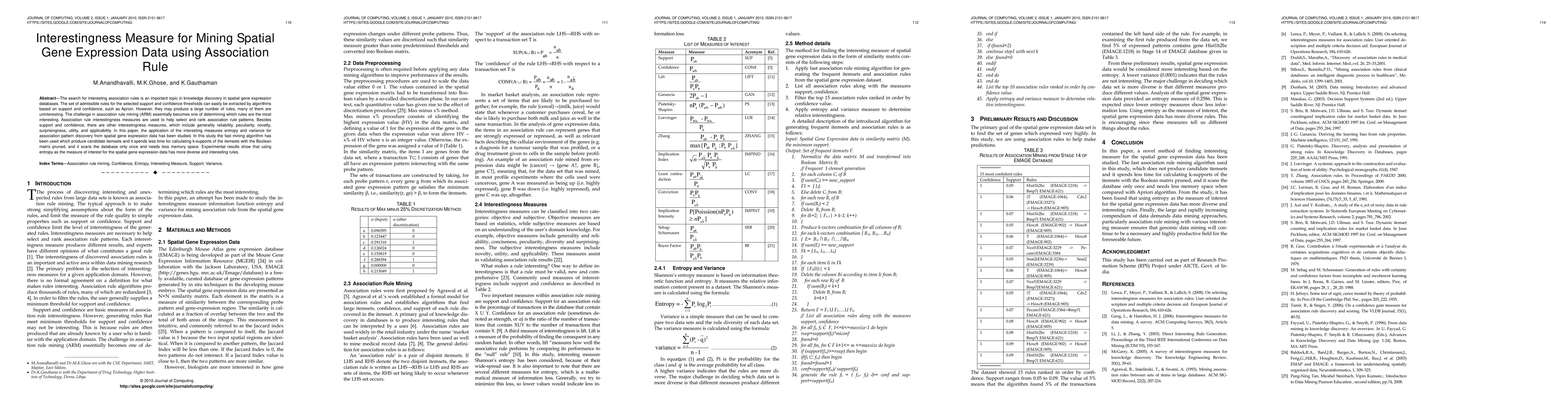 This research applies a fast association rule mining algorithm to generate frequent itemsets and association rules from spatial gene expression datasets, using entropy and variance as interestingness measures.