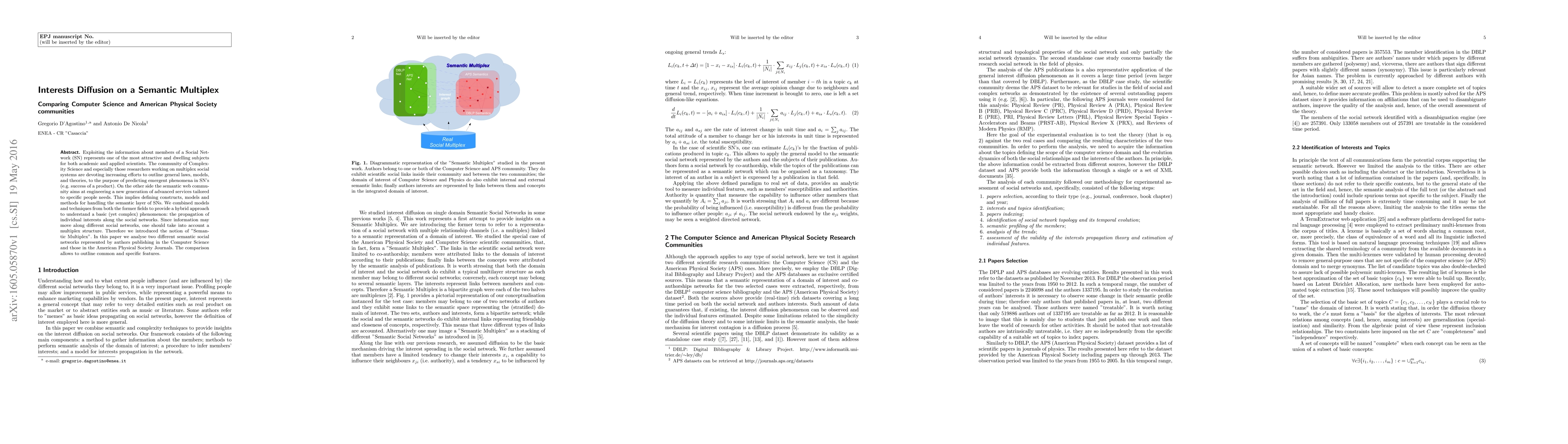 Exploiting the information about members of a Social Network (SN) represents one of the most attractive and dwelling subjects for both academic and applied scientists. The community of Complexity Science and especially those researchers working on multiplex social systems are devoting increasing efforts to outline general laws, models, and theories, to the purpose of predicting emergent phenomena in SN's (e.g. success of a product). On the other side the semantic web community aims at engineering a new generation of advanced services tailored to specific people needs. This implies defining constructs, models and methods for handling the semantic layer of SNs. We combined models and techniques from both the former fields to provide a hybrid approach to understand a basic (yet complex) phenomenon: the propagation of individual interests along the social networks. Since information may move along different social networks, one should take into account a multiplex structure. Therefore we introduced the notion of "Semantic Multiplex". In this paper we analyse two different semantic social networks represented by authors publishing in the Computer Science and those in the American Physical Society Journals. The comparison allows to outline common and specific features