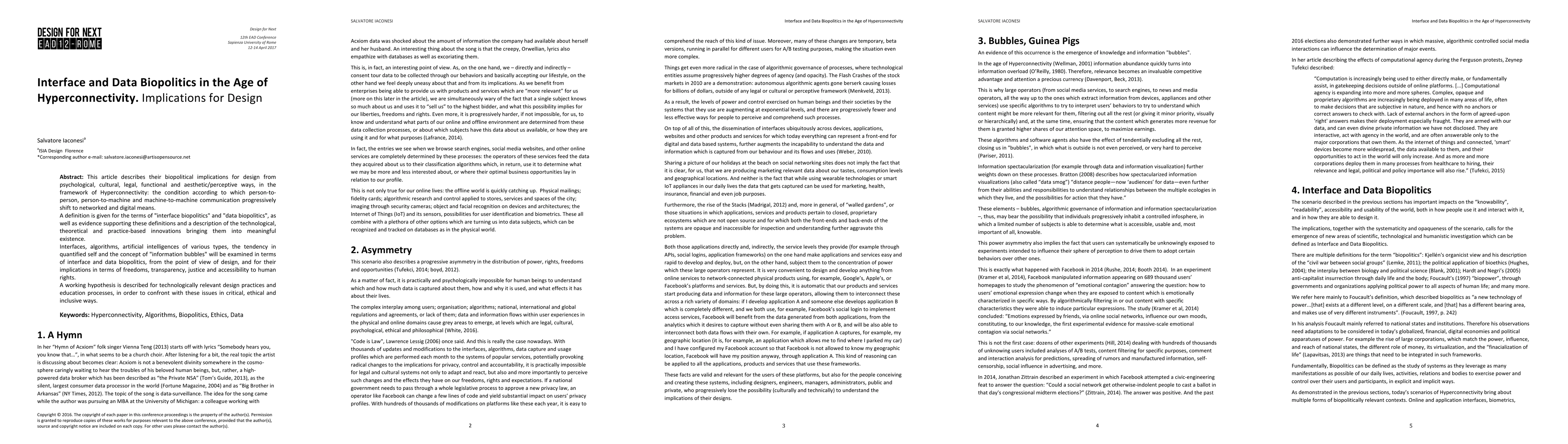 This article describes their biopolitical implications for design from psychological, cultural, legal, functional and aesthetic/perceptive ways, in the framework of Hyperconnectivity: the condition according to which person-to-person, person-to-machine and machine-to-machine communication progressively shift to networked and digital means. A definition is given for the terms of "interface biopolitics" and "data biopolitics", as well as evidence supporting these definitions and a description of the technological, theoretical and practice-based innovations bringing them into meaningful existence. Interfaces, algorithms, artificial intelligences of various types, the tendency in quantified self and the concept of "information bubbles" will be examined in terms of interface and data biopolitics, from the point of view of design, and for their implications in terms of freedoms, transparency, justice and accessibility to human rights. A working hypothesis is described for technologically relevant design practices and education processes, in order to confront with these issues in critical, ethical and inclusive ways.