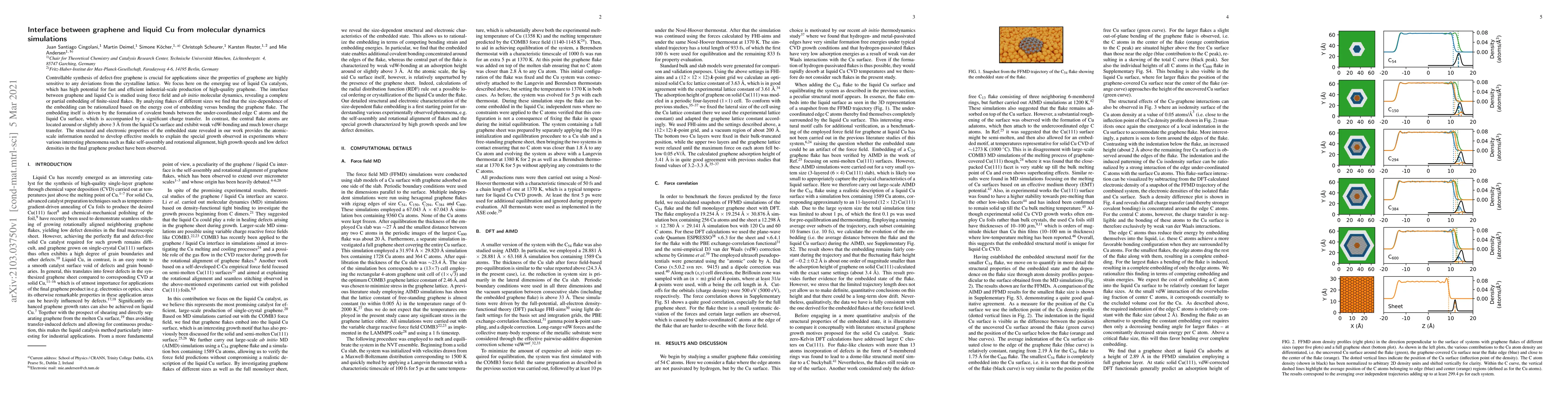 This paper investigates the interface between graphene and liquid Cu using molecular dynamics simulations, revealing that finite-sized graphene flakes partially or completely embed into the liquid Cu due to covalent bonding at the edges, driven by significant charge transfer. The study provides atomic-scale insights into the growth mechanisms of high-quality graphene using liquid Cu catalysts.