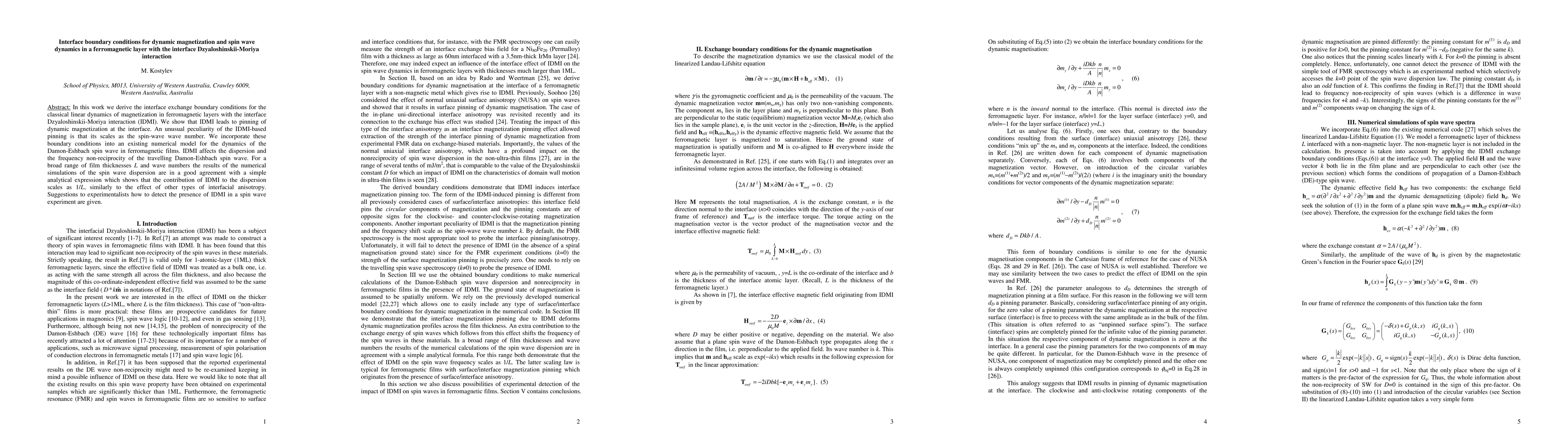 In this work we derive the interface exchange boundary conditions for the classical linear dynamics of magnetization in ferromagnetic layers with the interface Dzyaloshinskii-Moriya interaction (IDMI). We show that IDMI leads to pinning of dynamic magnetization at the interface. An unusual peculiarity of the IDMI-based pinning is that its scales as the spin-wave wave number. We incorporate these boundary conditions into an existing numerical model for the dynamics of the Damon-Eshbach spin wave in ferromagnetic films. IDMI affects the dispersion and the frequency non-reciprocity of the traveling Damon-Eshbach spin wave. For a broad range of film thicknesses L and wave numbers the results of the numerical simulations of the spin wave dispersion are in a good agreement with a simple analytical expression which shows that the contribution of IDMI to the dispersion scales as 1/L, similarly to the effect of other types of interfacial anisotropy. Suggestions to experimentalists how to detect the presence of IDMI in a spin wave experiment are given.
