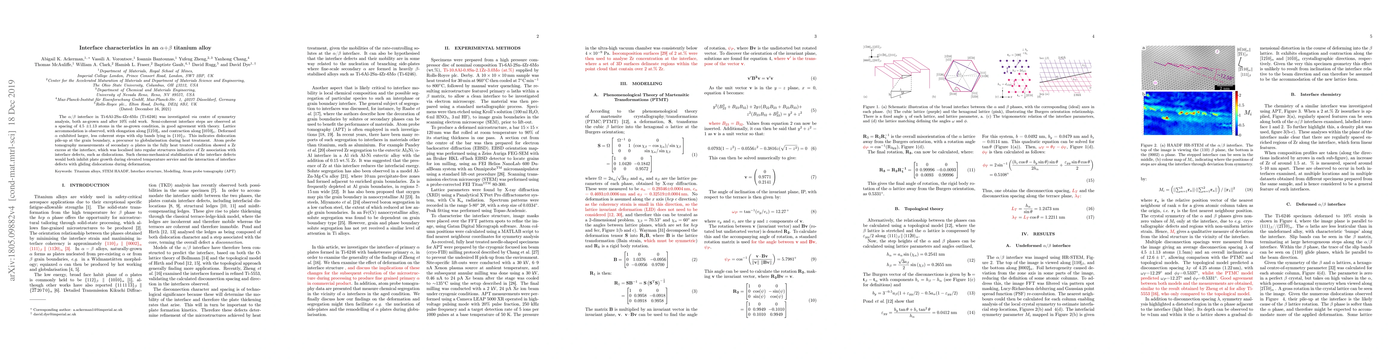 The alpha/beta interface in Ti-6Al-2Sn-4Zr-6Mo (Ti-6246) is investigated via centre of symmetry analysis, both as-grown and after 10% cold work. Semi-coherent interface steps are observed at a spacing of 4.5 +/-1.13 atoms in the as-grown condition, in good agreement with theory prediction (4.37 atoms). Lattice accommodation is observed, with elongation along [-1 2 -1 0]alpha and contraction along [1 0 -1 0]alpha . Deformed alpha exhibited larger, less coherent steps with slip bands lying in {110}beta. This indicates dislocation pile-up at the grain boundary, a precursor to globularisation, offering insight into the effect of deformation processing on the interface, which is important for titanium alloy processing route design.