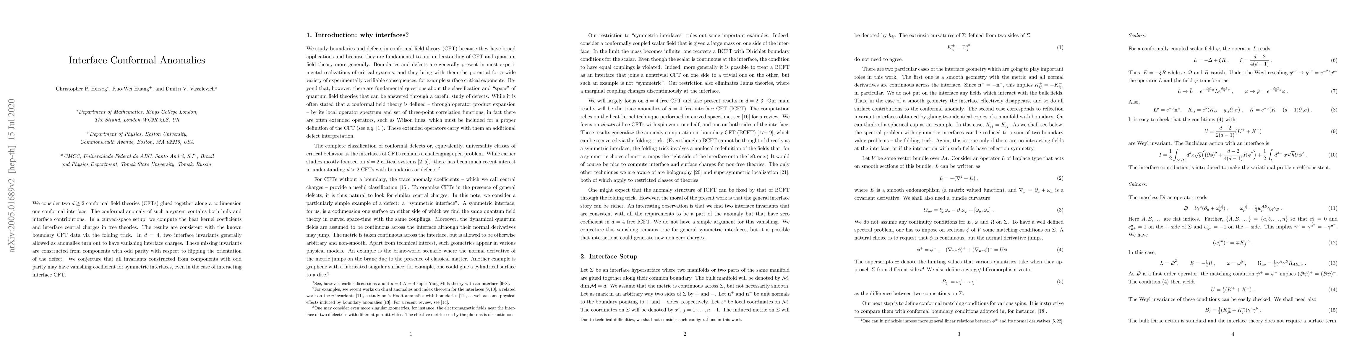 Researchers studied conformal field theories glued together along a codimension one conformal interface, finding that some invariants constructed from odd-parity components may have vanishing coefficients for symmetric interfaces, regardless of interaction.