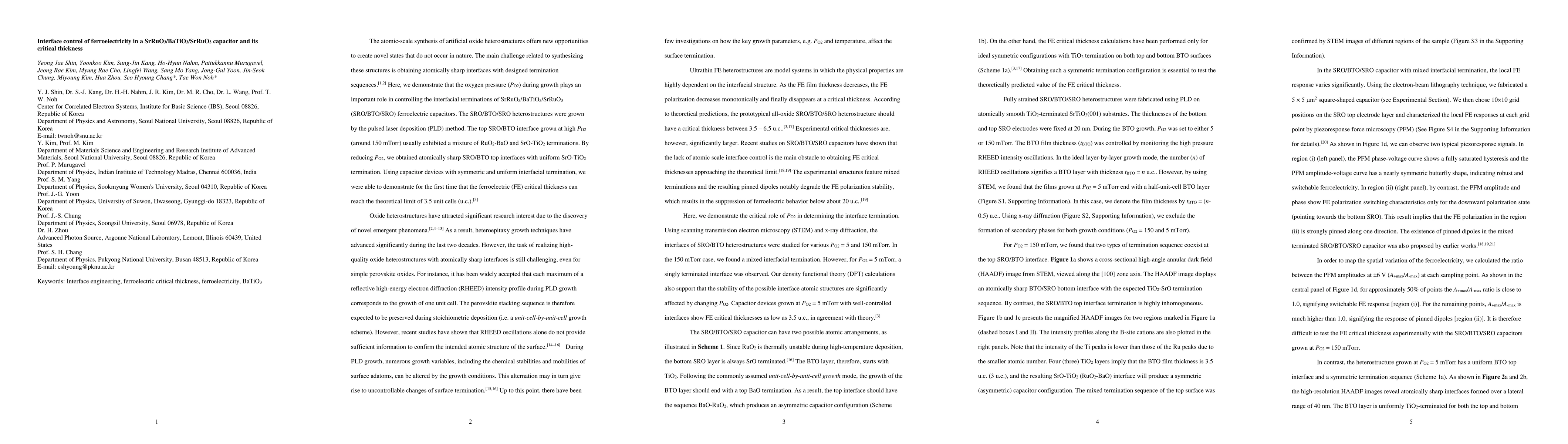 This paper investigates the role of oxygen pressure during the growth of SrRuO3/BaTiO3/SrRuO3 heterostructures, showing that lower oxygen pressure yields sharp interfaces with uniform SrO-TiO2 termination. The study demonstrates that ferroelectric critical thickness can reach the theoretical limit of 3.5 unit cells.
