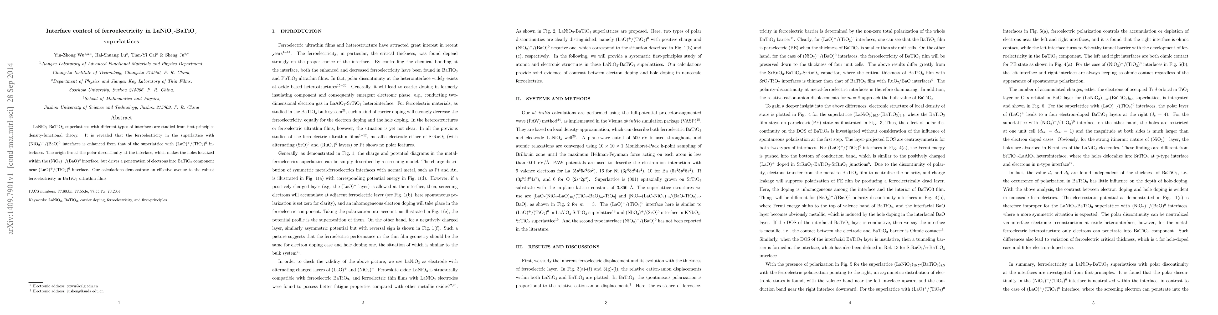 LaNiO$_{3}$-BaTiO$_{3}$ superlattices with different types of interfaces are studied from first-principles density-functional theory. It is revealed that the ferroelectricity in the superlattice with (NiO$_2$)$^-$/(BaO)$^0$ interfaces is enhanced from that of the superlattice with (LaO)$^+$/(TiO$_2$)$^0$ interfaces. The origin lies at the polar discontinuity at the interface, which makes the holes localized within the (NiO$_2$)$^-$/(BaO)$^0$ interface, but drives a penetration of electrons into BaTiO$_3$ component near (LaO)$^+$/(TiO$_2$)$^0$ interface. Our calculations demonstrate an effective avenue to the robust ferroelectricity in BaTiO$_3$ ultrathin films.