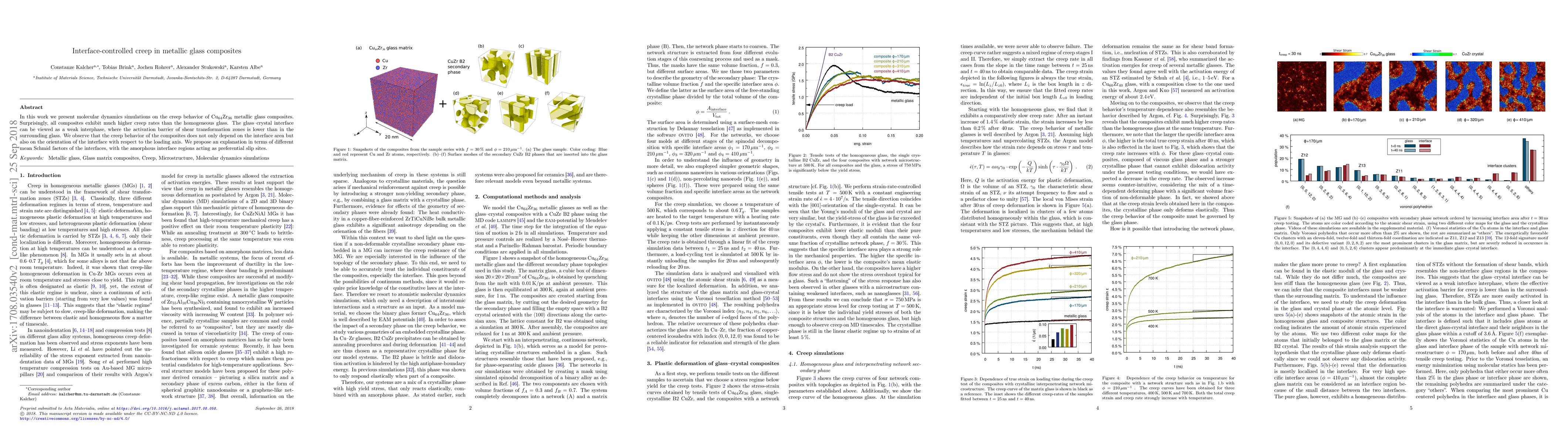 In this work we present molecular dynamics simulations on the creep behavior of $\rm Cu_{64}Zr_{36}$ metallic glass composites. Surprisingly, all composites exhibit much higher creep rates than the homogeneous glass. The glass-crystal interface can be viewed as a weak interphase, where the activation barrier of shear transformation zones is lower than in the surrounding glass. We observe that the creep behavior of the composites does not only depend on the interface area but also on the orientation of the interface with respect to the loading axis. We propose an explanation in terms of different mean Schmid factors of the interfaces, with the amorphous interface regions acting as preferential slip sites.