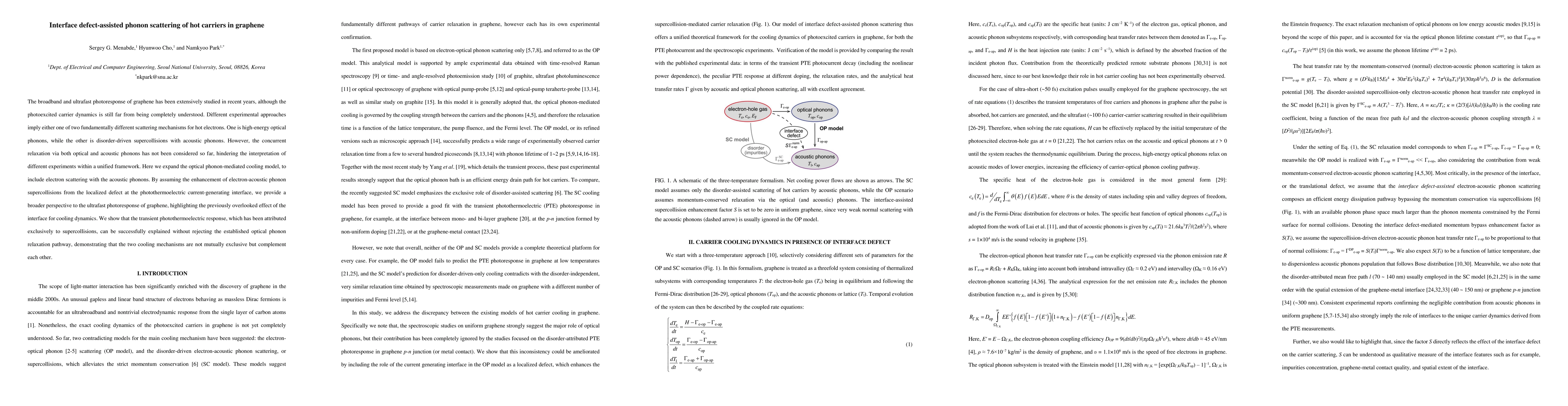 The broadband and ultrafast photoresponse of graphene has been extensively studied in recent years, although the photoexcited carrier dynamics is still far from being completely understood. Different experimental approaches imply either one of two fundamentally different scattering mechanisms for hot electrons. One is high-energy optical phonons, while the other is disorder-driven supercollisions with acoustic phonons. However, the concurrent relaxation via both optical and acoustic phonons has not been considered so far, hindering the interpretation of different experiments within a unified framework. Here we expand the optical phonon-mediated cooling model, to include electron scattering with the acoustic phonons. By assuming the enhancement of electron-acoustic phonon supercollisions from the localized defect at the photothermoelectric current-generating interface, we provide a broader perspective to the ultrafast photoresponse of graphene, highlighting the previously overlooked effect of the interface for cooling dynamics. We show that the transient photothermoelectric response, which has been attributed exclusively to supercollisions, can be successfully explained without rejecting the established optical phonon relaxation pathway, demonstrating that the two cooling mechanisms are not mutually exclusive but complement each other.