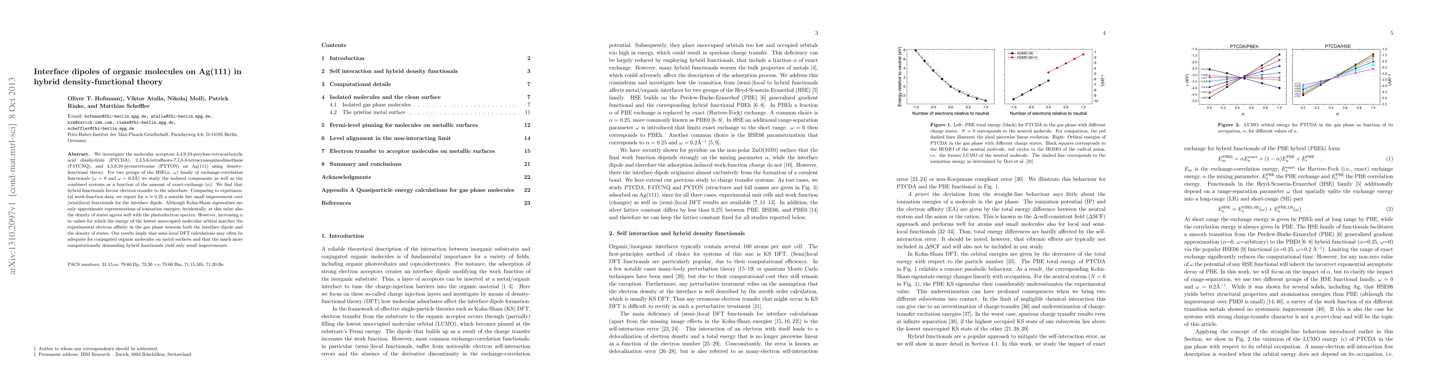 We investigate the molecular acceptors 3,4,9,10-perylene-tetracarboxylic acid dianhydride (PTCDA), 2,3,5,6-tetra uoro-7,7,8,8-tetracyanoquinodimethane (F4TCNQ), and 4,5,9,10-pyrenetetraone (PYTON) on Ag(111) using densityfunctional theory. For two groups of the HSE(\alpha, \omega) family of exchange-correlation functionals (\omega = 0 and \omega = 0.2\AA) we study the isolated components as well as the combined systems as a function of the amount of exact-exchange (\alpha). We find that hybrid functionals favour electron transfer to the adsorbate. Comparing to experimental work-function data, we report for (\alpha) ca. 0.25 a notable but small improvement over (semi)local functionals for the interface dipole. Although Kohn-Sham eigenvalues are only approximate representations of ionization energies, incidentally, at this value also the density of states agrees well with the photoelectron spectra. However, increasing (\alpha) to values for which the energy of the lowest unoccupied molecular orbital matches the experimental electron affinity in the gas phase worsens both the interface dipole and the density of states. Our results imply that semi-local DFT calculations may often be adequate for conjugated organic molecules on metal surfaces and that the much more computationally demanding hybrid functionals yield only small improvements.
