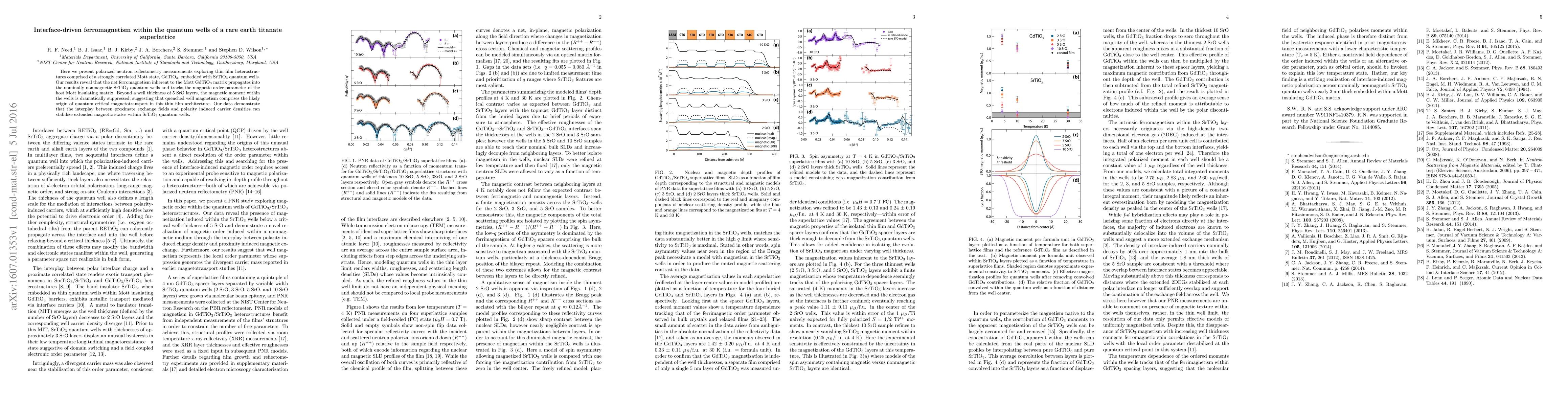 Here we present polarized neutron reflectometry measurements exploring thin film heterostructures comprised of a strongly correlated Mott state, GdTiO$_3$, embedded with SrTiO$_3$ quantum wells. Our results reveal that the net ferromagnetism inherent to the Mott GdTiO$_3$ matrix propagates into the nominally nonmagnetic SrTiO$_3$ quantum wells and tracks the magnetic order parameter of the host Mott insulating matrix. Beyond a well thickness of 5 SrO layers, the magnetic moment within the wells is dramatically suppressed, suggesting that quenched well magnetism comprises the likely origin of quantum critical magnetotransport in this thin film architecture. Our data demonstrate that the interplay between proximate exchange fields and polarity induced carrier densities can stabilize extended magnetic states within SrTiO$_3$ quantum wells.