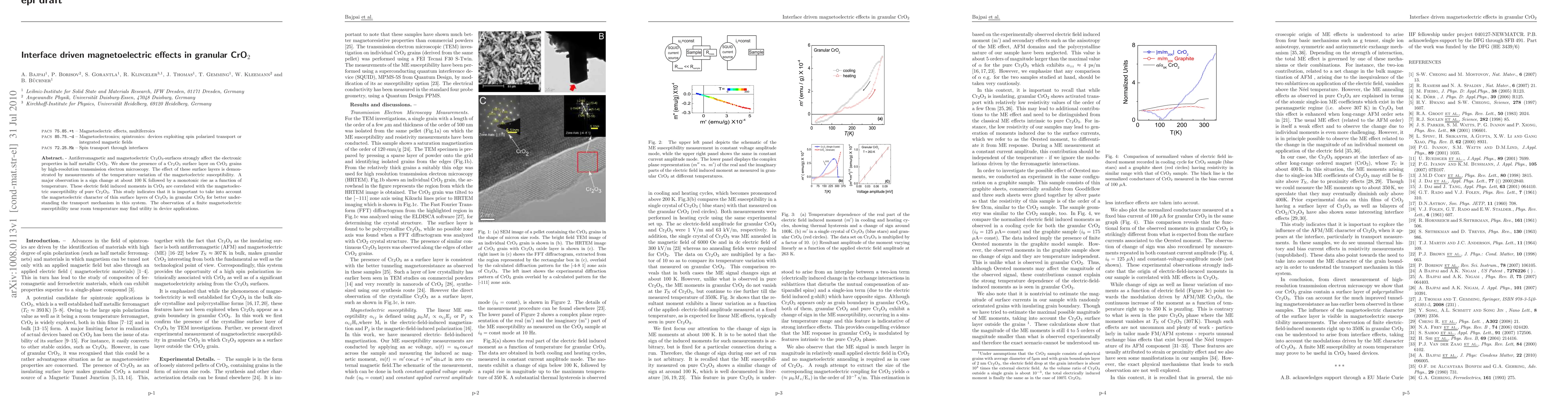 Antiferromagnetic and magnetoelectric Cr2O3-surfaces strongly affect the electronic properties in half metallic CrO2. We show the presence of a Cr2O3 surface layer on CrO3 grains by high-resolution transmission electron microscopy. The effect of these surface layers is demonstrated by measurements of the temperature variation of the magnetoelectric susceptibility. A major observation is a sign change at about 100 K followed by a monotonic rise as a function of temperature. These electric field induced moments in CrO3 are correlated with the magnetoelectric susceptibility of pure Cr2O3. This study indicates that it is important to take into account the magnetoelectric character of thin surface layers of Cr2O3 in granular CrO2 for better understanding the transport mechanism in this system. The observation of a finite magnetoelectric susceptibility near room temperature may find utility in device applications.