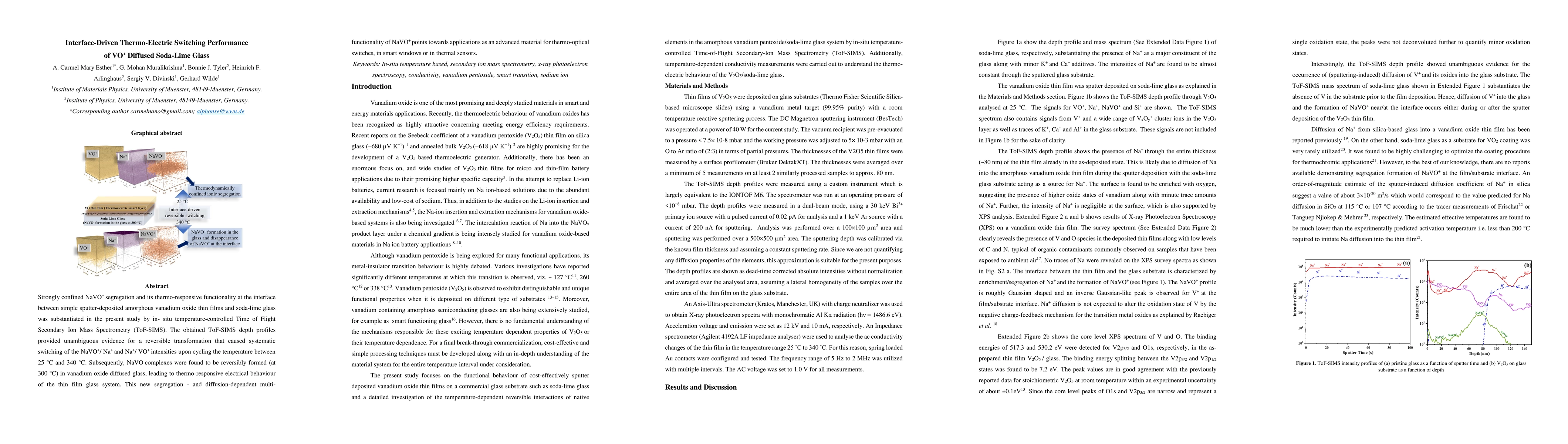This study investigates the thermo-electric switching performance of VO$^+$ diffused soda-lime glass, revealing reversible transformations in NaVO$^+$ segregation at the interface of vanadium oxide thin films using ToF-SIMS. The findings suggest potential applications in thermo-optical switches, smart windows, and thermal sensors.