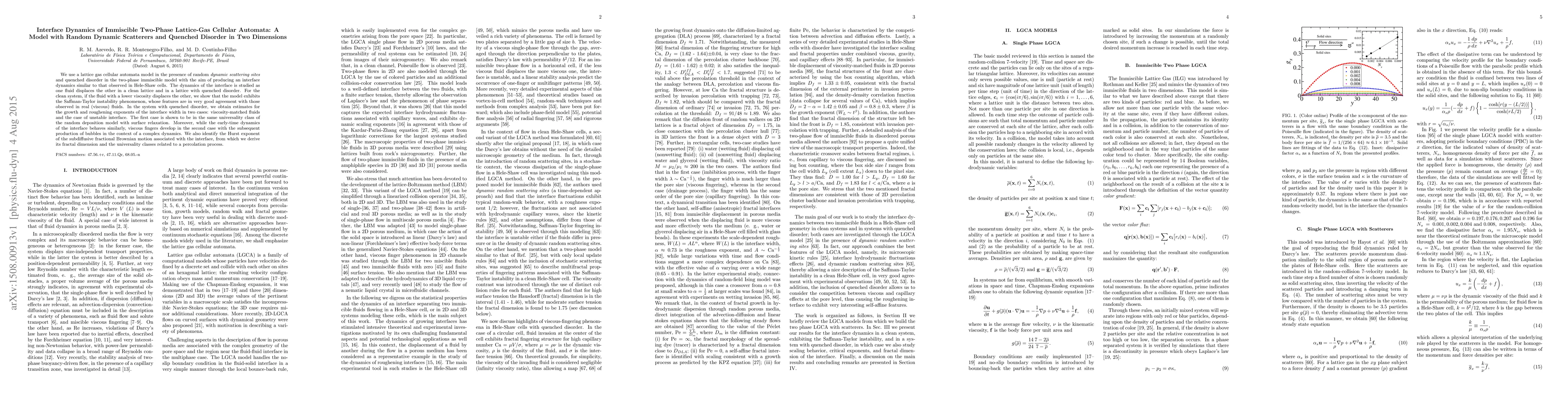 This paper studies the interface dynamics in a two-phase lattice gas cellular automata model with random dynamic scatterers and quenched disorder, observing phenomena like the Saffman-Taylor instability and complex dynamics including bubble formation, while identifying the fractal dimension and universality classes related to the interface behavior.