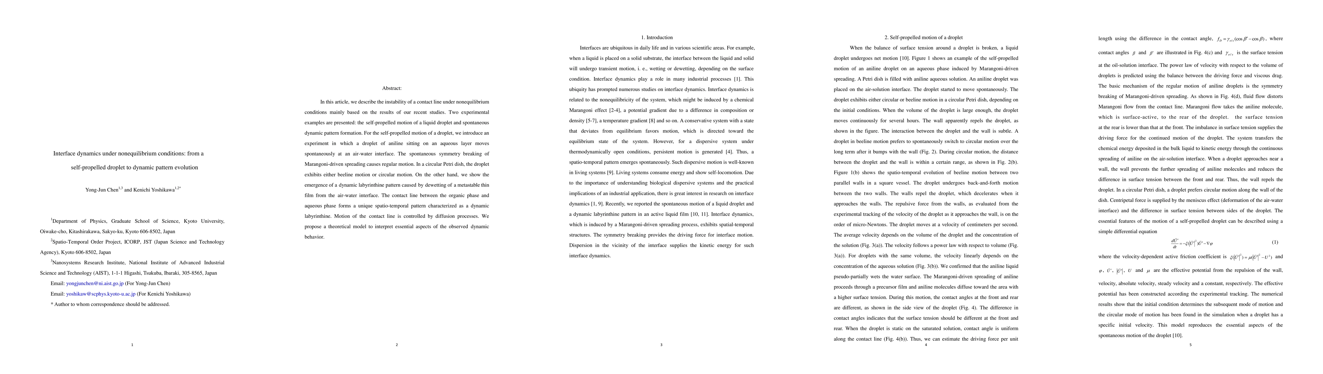 In this article, we describe the instability of a contact line under nonequilibrium conditions mainly based on the results of our recent studies. Two experimental examples are presented: the self-propelled motion of a liquid droplet and spontaneous dynamic pattern formation. For the self-propelled motion of a droplet, we introduce an experiment in which a droplet of aniline sitting on an aqueous layer moves spontaneously at an air-water interface. The spontaneous symmetry breaking of Marangoni-driven spreading causes regular motion. In a circular Petri dish, the droplet exhibits either beeline motion or circular motion. On the other hand, we show the emergence of a dynamic labyrinthine pattern caused by dewetting of a metastable thin film from the air-water interface. The contact line between the organic phase and aqueous phase forms a unique spatio-temporal pattern characterized as a dynamic labyrinthine. Motion of the contact line is controlled by diffusion processes. We propose a theoretical model to interpret essential aspects of the observed dynamic behavior.