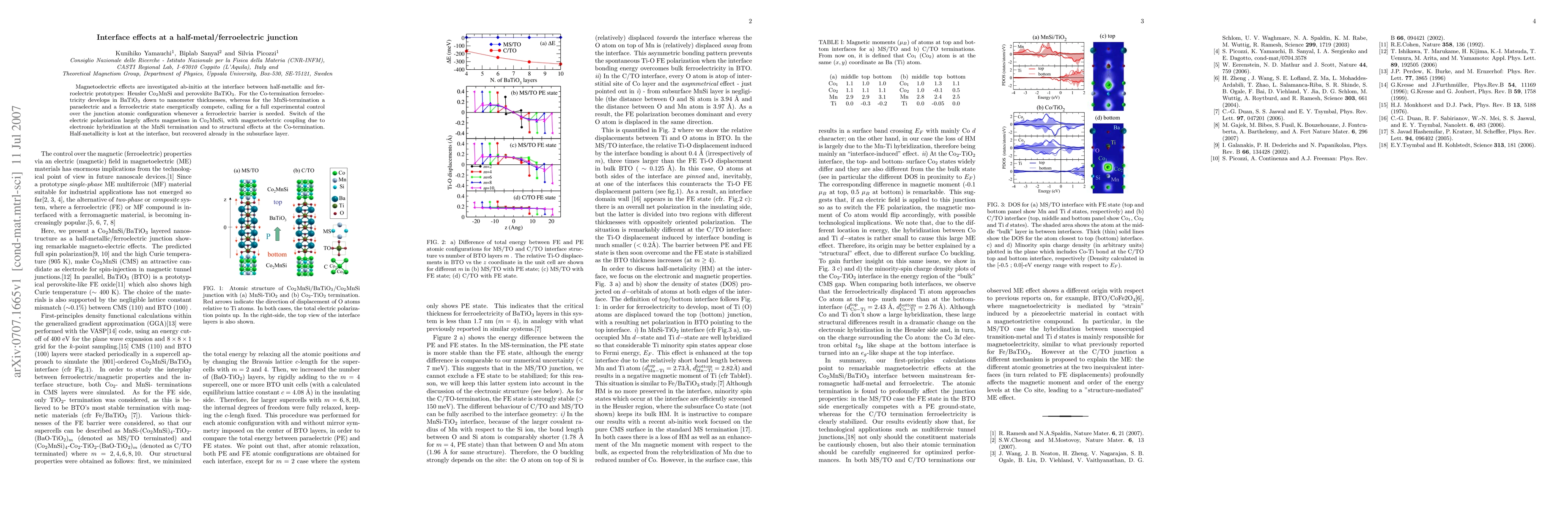 Magnetoelectric effects are investigated ab-initio at the interface between half-metallic and ferroelectric prototypes: Heusler Co$_2$MnSi and perovskite BaTiO$_3$. For the Co-termination ferroelectricity develops in BaTiO$_3$ down to nanometer thicknesses, whereas for the MnSi-termination a paraelectric and a ferroelectric state energetically compete, calling for a full experimental control over the junction atomic configuration whenever a ferroelectric barrier is needed. Switch of the electric polarization largely affects magnetism in Co$_2$MnSi, with magnetoelectric coupling due to electronic hybridization at the MnSi termination and to structural effects at the Co-termination. Half-metallicity is lost at the interface, but recovered already in the subsurface layer.