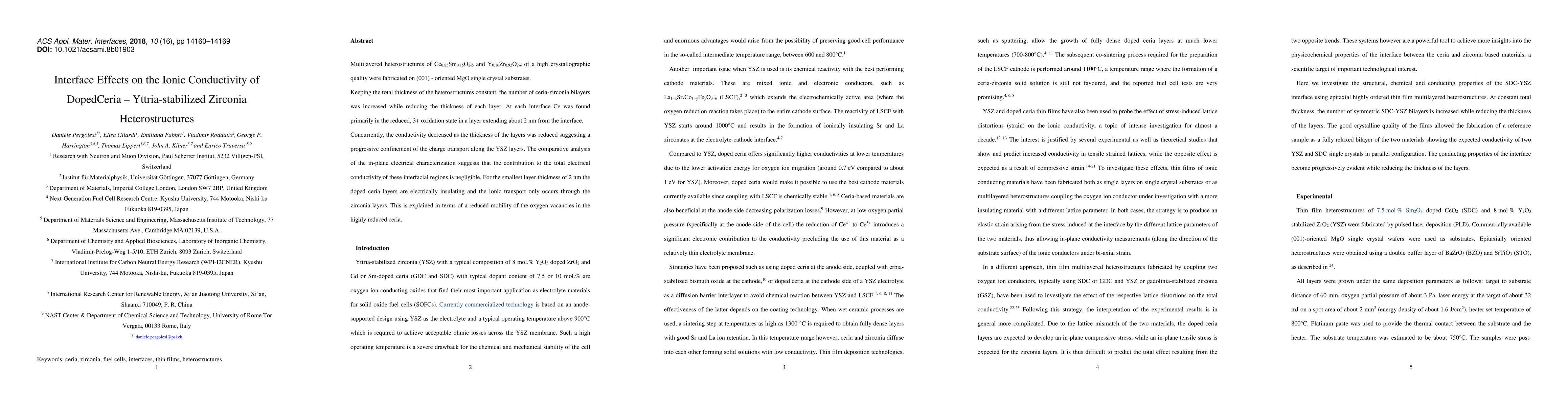 Multilayered heterostructures of Ce0.85Sm0.15O2-delta and Y0.16Zr0.92O2-delta of a high crystallographic quality were fabricated on (001) - oriented MgO single crystal substrates. Keeping the total thickness of the heterostructures constant, the number of ceria-zirconia bilayers was increased while reducing the thickness of each layer. At each interface Ce was found primarily in the reduced, 3+ oxidation state in a layer extending about 2 nm from the interface. Concurrently, the conductivity decreased as the thickness of the layers was reduced suggesting a progressive confinement of the charge transport along the YSZ layers. The comparative analysis of the in-plane electrical characterization suggests that the contribution to the total electrical conductivity of these interfacial regions is negligible. For the smallest layer thickness of 2 nm the doped ceria layers are electrically insulating and the ionic transport only occurs through the zirconia layers. This is explained in terms of a reduced mobility of the oxygen vacancies in the highly reduced ceria.