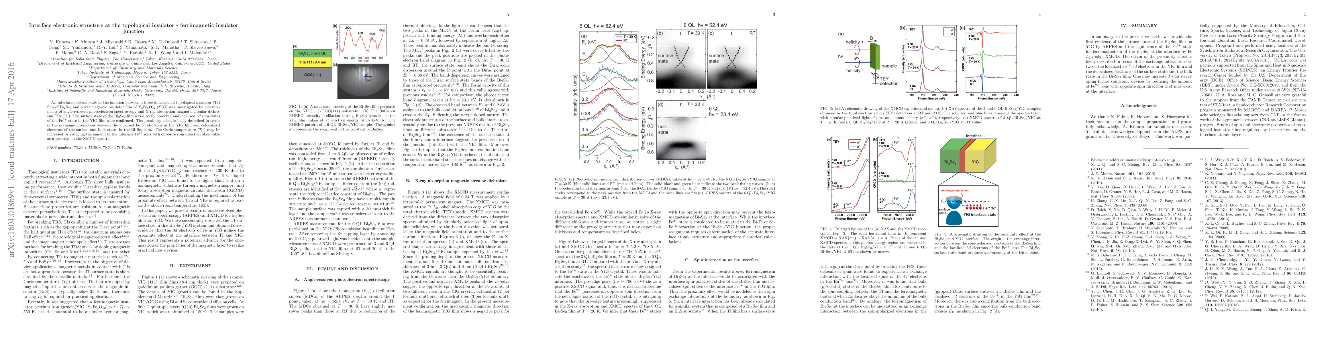 This paper investigates the interface electronic structure between a topological insulator Bi2Se3 and a ferrimagnetic insulator YIG using angle-resolved photoelectron spectroscopy and XMCD. It confirms the presence of surface states in Bi2Se3 and localized Fe 3d spin states in YIG, suggesting an exchange interaction between the two materials and potential for increased Curie temperature by minimizing interface Fe2+ ions.