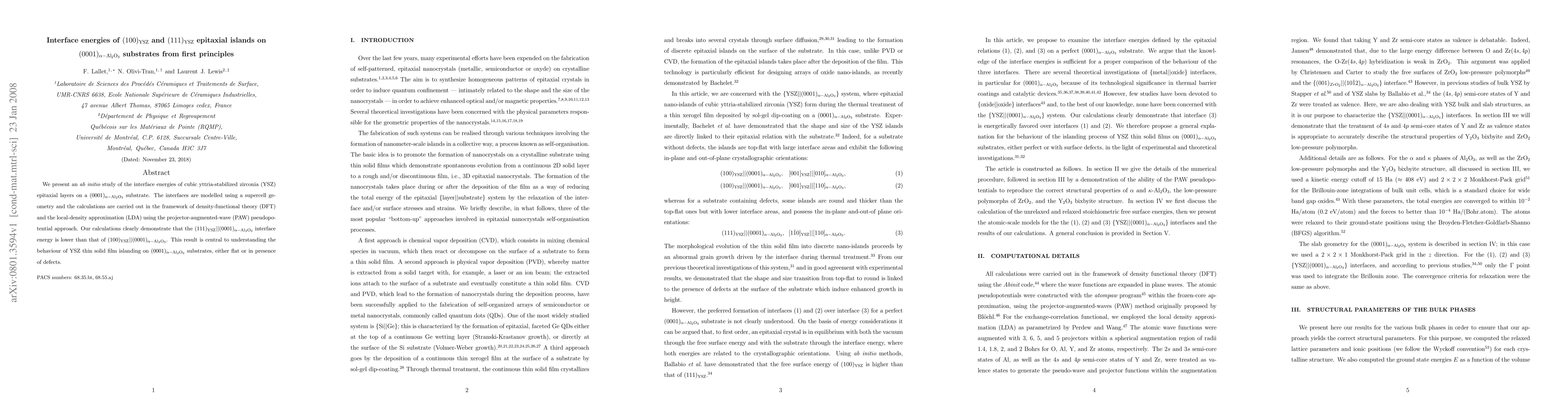 We present an ab initio study of the interface energies of cubic yttria-stabilized zirconia (YSZ) epitaxial layers on a (0001)_{alpha-Al_2O_3} substrate. The interfaces are modelled using a supercell geometry and the calculations are carried out in the framework of density-functional theory (DFT) and the local-density approximation (LDA) using the projector-augmented-wave (PAW) pseudopotential approach. Our calculations clearly demonstrate that the (111)_{YSZ} || (0001)_{alpha-Al_2O_3} interface energy is lower than that of (100)_{YSZ} || (0001)_{alpha-Al_2O_3}. This result is central to understanding the behaviour of YSZ thin solid film islanding on (0001)_{alpha-Al_2O_3} substrates, either flat or in presence of defects.