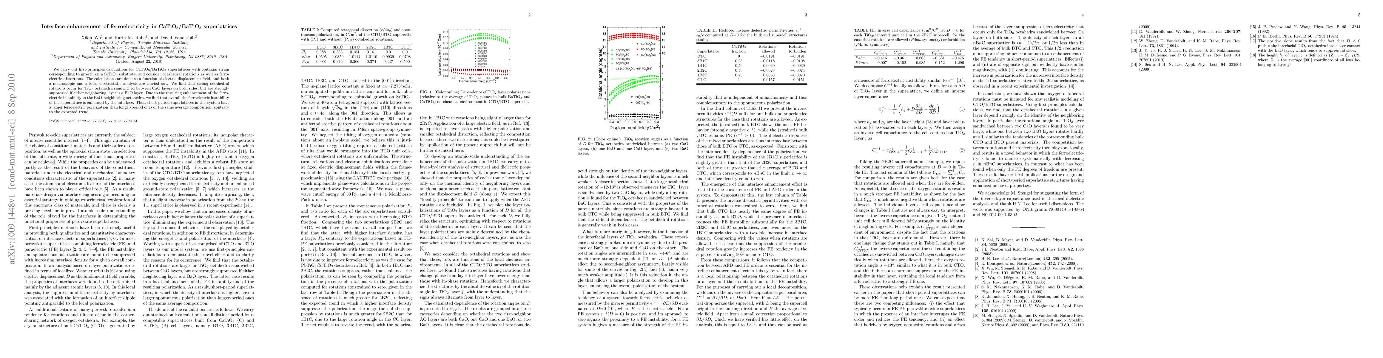 We carry out first-principles calculations for CaTiO$_3$/BaTiO$_3$ superlattices with epitaxial strain corresponding to growth on a SrTiO$_3$ substrate, and consider octahedral rotations as well as ferroelectric distortions. The calculations are done as a function of electric displacement field, and both a macroscopic and a local electrostatic analysis are carried out. We find that strong octahedral rotations occur for TiO$_6$ octahedra sandwiched between CaO layers on both sides, but are strongly suppressed if either neighboring layer is a BaO layer. Due to the resulting enhancement of the ferroelectric instability in the BaO-neighboring octahedra, we find that overall the ferroelectric instability of the superlattice is enhanced by the interface. Thus, short-period superlattices in this system have a larger ferroelectric polarization than longer-period ones of the same average composition, contrary to the expected trend.