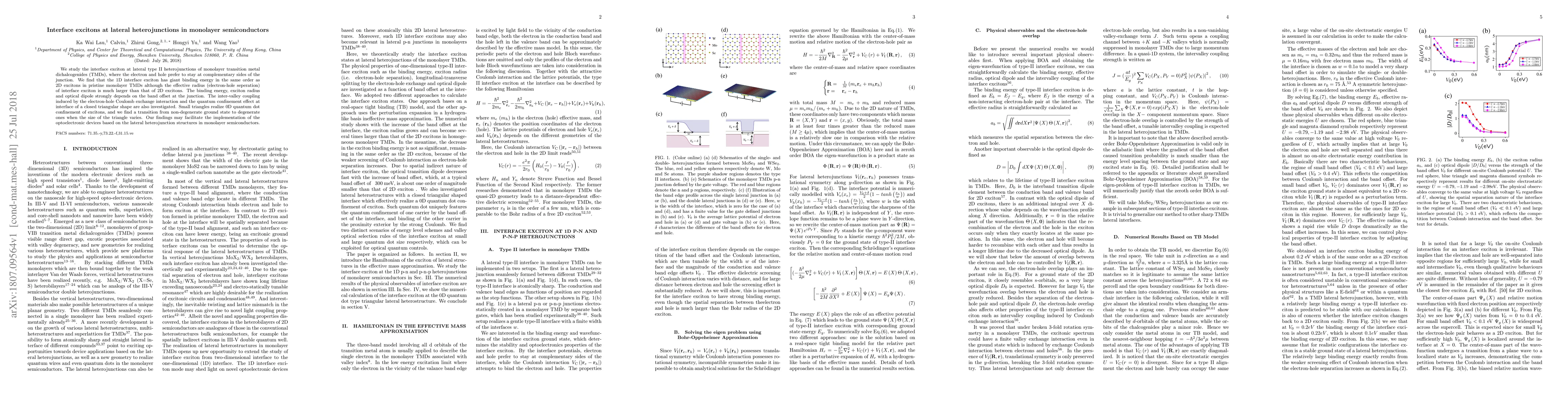 This paper explores interface excitons at lateral heterojunctions in monolayer transition metal dichalcogenides, revealing that they possess giant binding energies comparable to 2D excitons despite larger effective radii. The study also investigates the influence of band offset and inter-valley coupling on exciton properties and finds a transition in quantum confinement effects in triangular junction shapes.