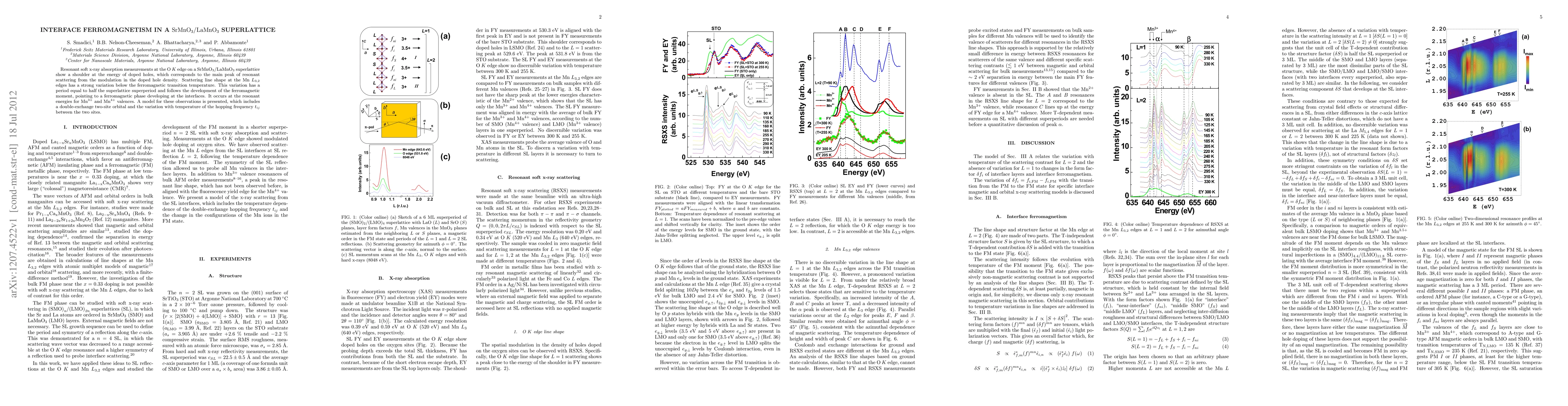 This paper investigates the interface ferromagnetism in SrMnO3/LaMnO3 superlattices using resonant soft x-ray absorption, revealing a ferromagnetic phase at the interfaces linked to modulation in doped hole density and variations in scattering line shape below the transition temperature. The model incorporates a double-exchange mechanism and temperature-dependent hopping frequency.