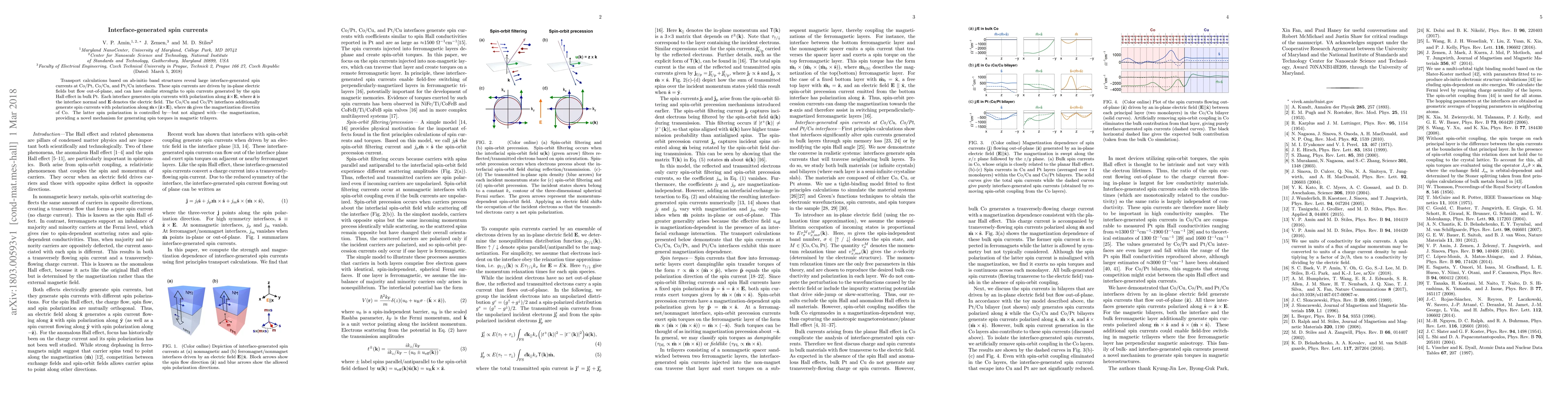 Transport calculations based on ab-initio band structures reveal large interface-generated spin currents at Co/Pt, Co/Cu, and Pt/Cu interfaces. These spin currents are driven by in-plane electric fields but flow out-of-plane, and can have similar strengths to spin currents generated by the spin Hall effect in bulk Pt. Each interface generates spin currents with polarization along $\bf{\hat{z}} \times \bf{E}$, where $\bf{\hat{z}}$ is the interface normal and $\bf{E}$ denotes the electric field. The Co/Cu and Co/Pt interfaces additionally generate spin currents with polarization along $\bf{\hat{m}} \times (\bf{\hat{z}} \times \bf{E})$, where $\bf{\hat{m}}$ gives the magnetization direction of Co. The latter spin polarization is controlled by---but not aligned with---the magnetization, providing a novel mechanism for generating spin torques in magnetic trilayers.