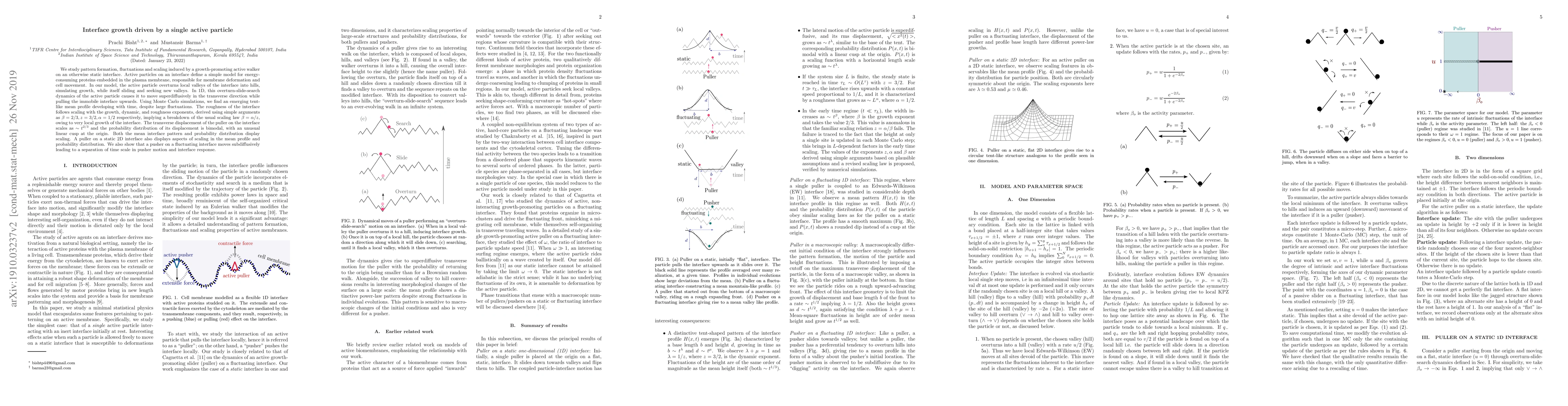 We study pattern formation, fluctuations and scaling induced by a growth-promoting active walker on an otherwise static interface. Active particles on an interface define a simple model for energy consuming proteins embedded in the plasma membrane, responsible for membrane deformation and cell movement. In our model, the active particle overturns local valleys of the interface into hills, simulating growth, while itself sliding and seeking new valleys. In 1D, this overturn-slide-search dynamics of the active particle causes it to move superdiffusively in the transverse direction while pulling the immobile interface upwards. Using Monte Carlo simulations, we find an emerging tent-like mean profile developing with time, despite large fluctuations. The roughness of the interface follows scaling with the growth, dynamic and roughness exponents, derived using simple arguments as $\beta=2/3, z=3/2, \alpha=1/2$ respectively, implying a breakdown of the usual scaling law $\beta = \alpha/z$, owing to very local growth of the interface. The transverse displacement of the puller on the interface scales as $\sim t^{2/3}$ and the probability distribution of its displacement is bimodal, with an unusual linear cusp at the origin. Both the mean interface pattern and probability distribution display scaling. A puller on a static 2D interface also displays aspects of scaling in the mean profile and probability distribution. We also show that a pusher on a fluctuating interface moves subdiffusively leading to a separation of time scale in pusher motion and interface response.