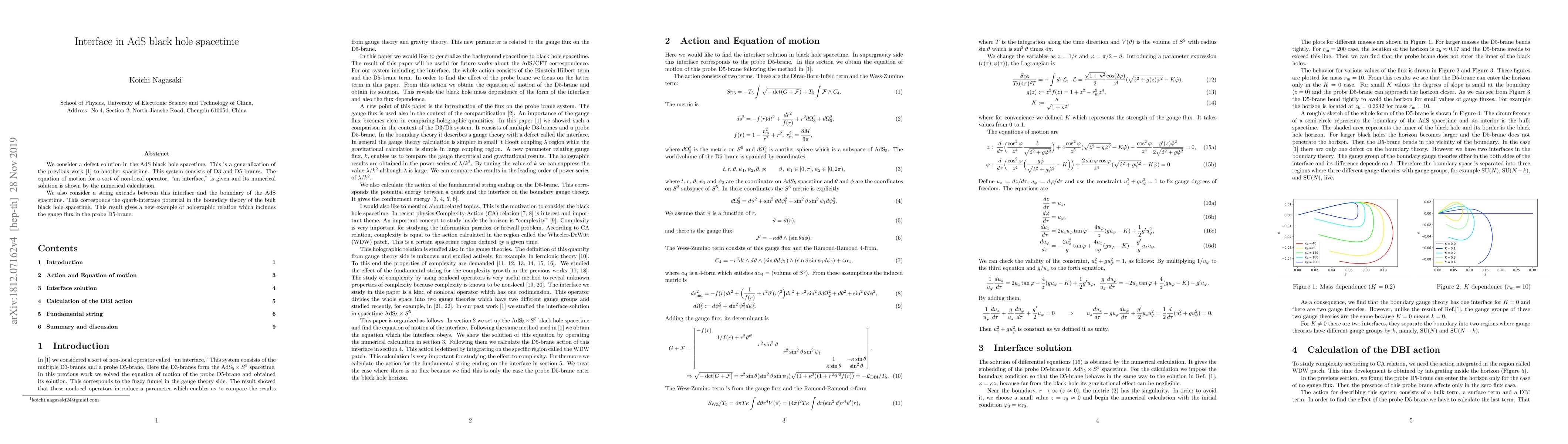 This paper studies a defect in AdS black hole spacetime, deriving an equation of motion for the interface and calculating its solution through numerical methods. It also considers the Nambu-Goto action of a string affected by this interface, relating it to the quark-interface potential in black holes.