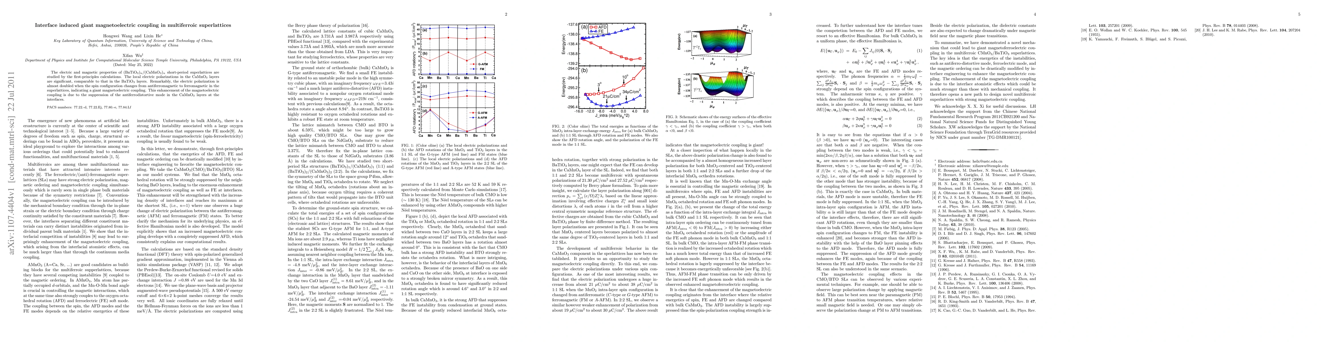 The electric and magnetic properties of (BaTiO$_3$)$_n$/(CaMnO$_3$)$_n$ short-period superlattices are studied by the first-principles calculations. The local electric polarizations in the CaMnO$_3$ layers are significant, comparable to that in the BaTiO$_3$ layers. Remarkably, the electric polarization is almost doubled when the spin configuration changes from antiferromagnetic to ferromagnetic in the superlattices, indicating a giant magnetoelectric coupling. This enhancement of the magnetoelectric coupling is due to the suppression of the antiferrodistortive mode in the CaMnO$_3$ layers at the interfaces.