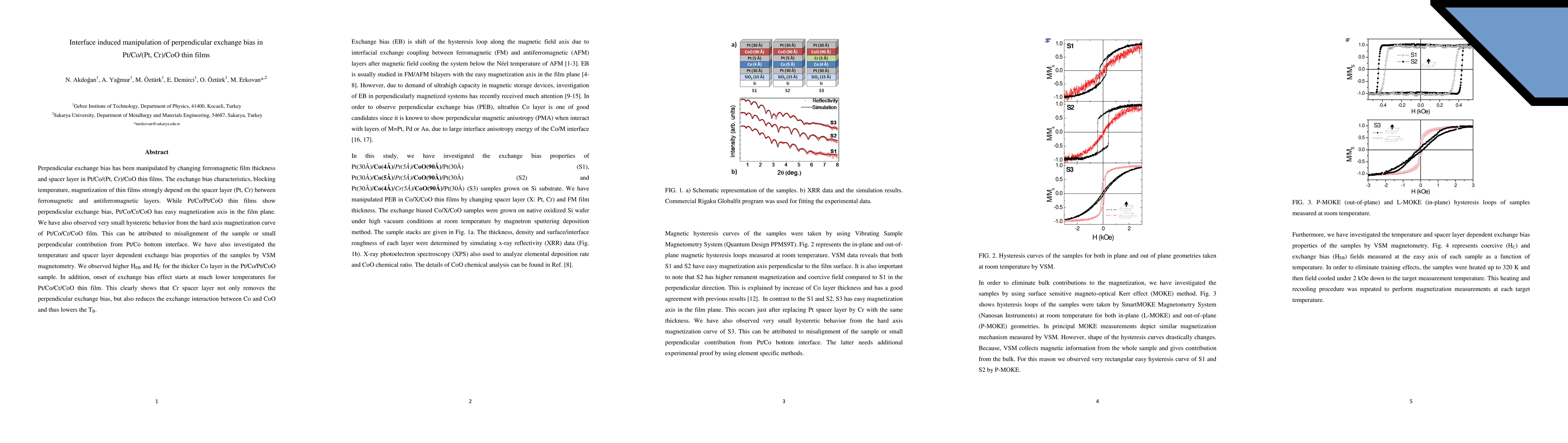 This study investigates how varying the thickness of ferromagnetic films and the spacer layer in Pt/Co/(Pt, Cr)/CoO thin films affects perpendicular exchange bias. The results show that a Pt spacer maintains perpendicular exchange bias, while a Cr spacer aligns magnetization in-plane, reducing blocking temperature and exchange interaction.