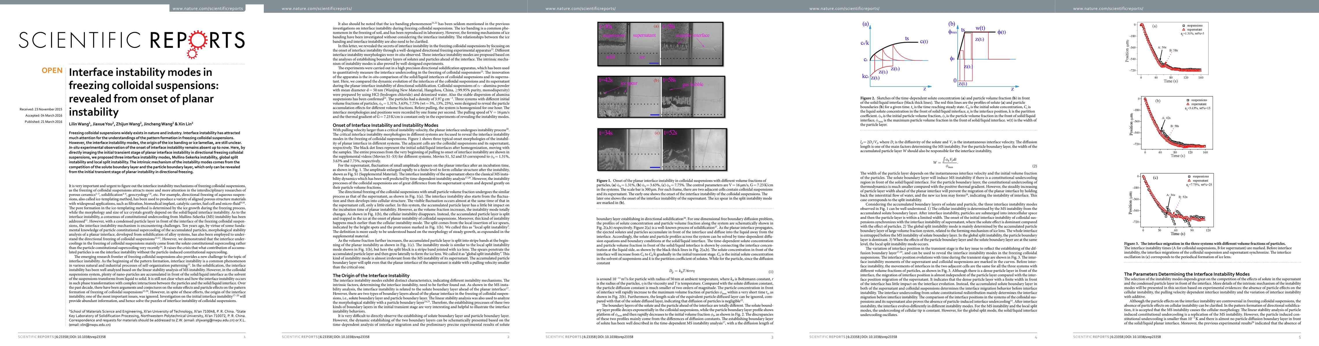 This paper identifies three interface instability modes—Mullins-Sekerka, global split, and local split—in freezing colloidal suspensions, revealing their origins through in-situ imaging of the initial planar instability stage. These modes arise from the competition between solute and particle boundary layers during directional freezing.