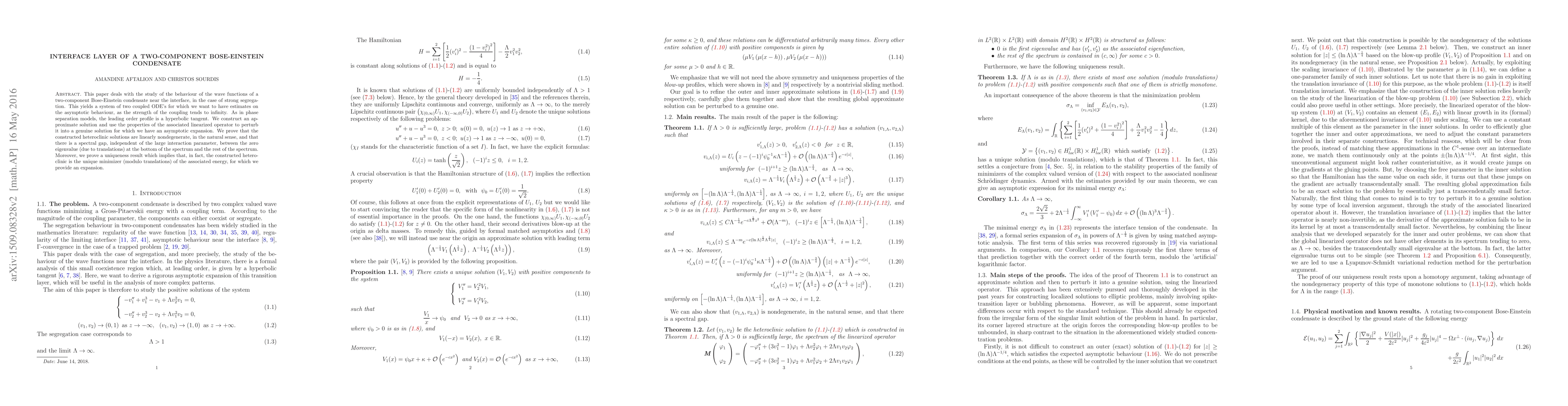 This paper deals with the study of the behaviour of the wave functions of a two-component Bose-Einstein condensate near the interface, in the case of strong segregation. This yields a system of two coupled ODE's for which we want to have estimates on the asymptotic behaviour, as the strength of the coupling tends to infinity. As in phase separation models, the leading order profile is a hyperbolic tangent. We construct an approximate solution and use the properties of the associated linearized operator to perturb it into a genuine solution for which we have an asymptotic expansion. We prove that the constructed heteroclinic solutions are linearly nondegenerate, in the natural sense, and that there is a spectral gap, independent of the large interaction parameter, between the zero eigenvalue (due to translations) at the bottom of the spectrum and the rest of the spectrum. Moreover, we prove a uniqueness result which implies that, in fact, the constructed heteroclinic is the unique minimizer (modulo translations) of the associated energy, for which we provide an expansion.