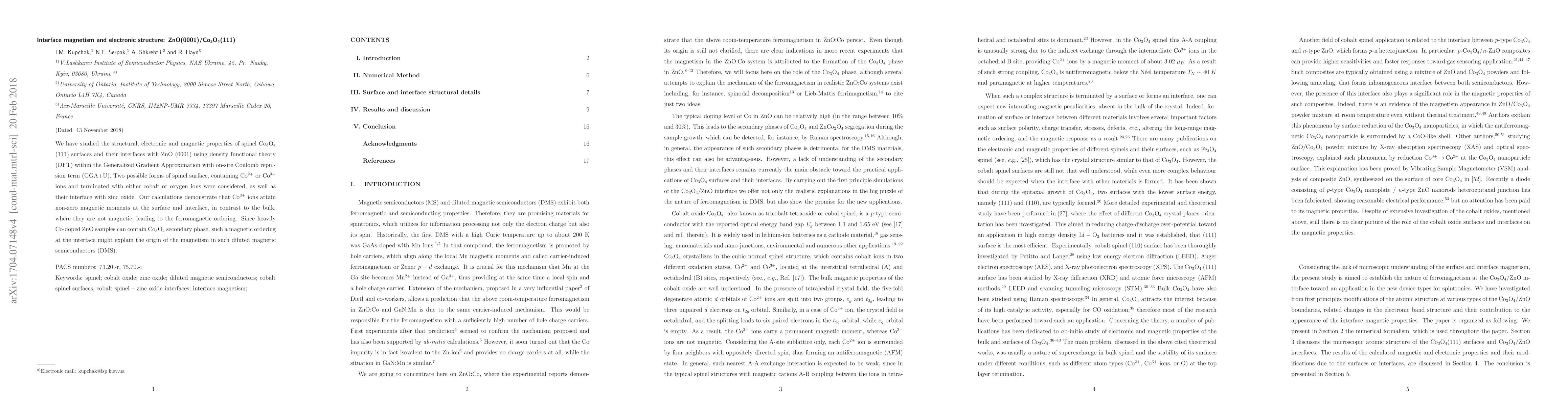 We have studied the structural, electronic and magnetic properties of spinel $\rm Co_3O_4$(111) surfaces and their interfaces with ZnO (0001) using density functional theory (DFT) within the Generalized Gradient Approximation with on-site Coulomb repulsion term (GGA+U). Two possible forms of spinel surface, containing $\rm Co^{2+} $ and $\rm Co^{3+} $ ions and terminated with either cobalt or oxygen ions were considered, as well as their interface with zinc oxide. Our calculations demonstrate that $\rm Co^{3+} $ ions attain non-zero magnetic moments at the surface and interface, in contrast to the bulk, where they are not magnetic, leading to the ferromagnetic ordering. Since heavily Co-doped ZnO samples can contain $\rm Co_3O_4 $ secondary phase, such a magnetic ordering at the interface might explain the origin of the magnetism in these diluted magnetic semiconductors (DMS).