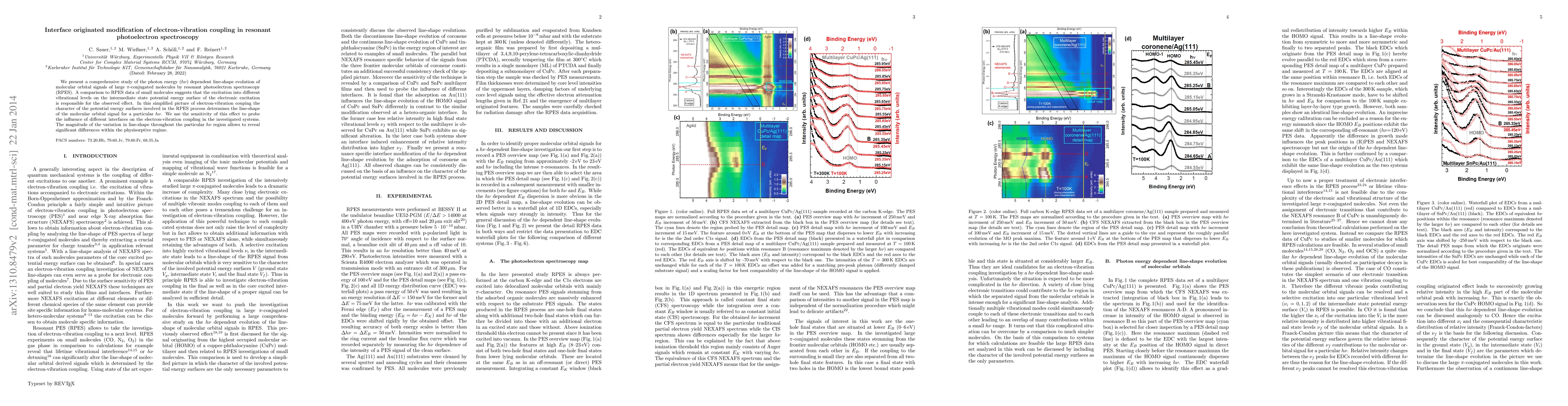 This study explores how photon energy affects molecular orbital signals in large conjugated molecules via resonant photoelectron spectroscopy (RPES). The research reveals that excitation into various vibrational levels on the intermediate state potential energy surface influences the line-shape of these signals. By observing the effect's sensitivity to interfaces, the researchers can discern significant differences in the physisorptive regime, shedding light on electron-vibration coupling modifications.