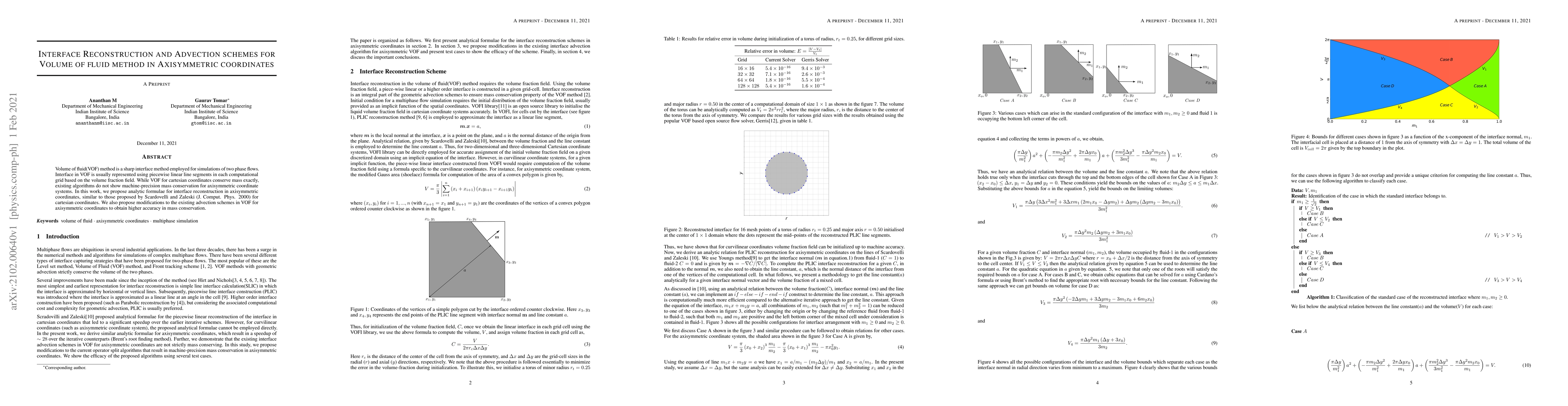 This paper proposes analytic formulae for interface reconstruction and modified advection schemes for the Volume of Fluid (VOF) method in axisymmetric coordinates to achieve higher accuracy in mass conservation compared to existing algorithms, which do not conserve mass precisely in such systems.