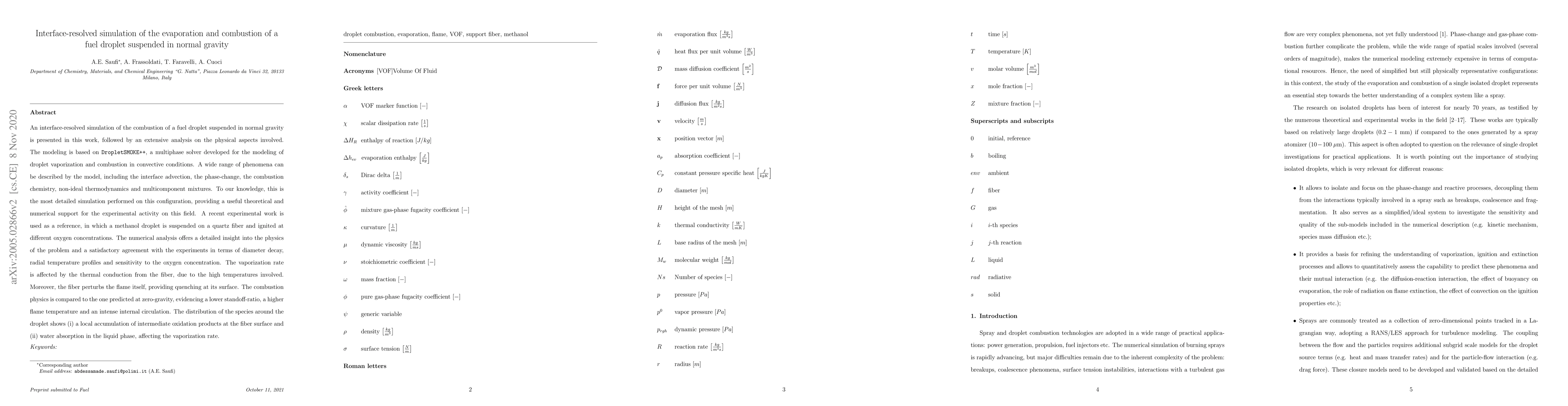 An interface-resolved simulation of the combustion of a fuel droplet suspended in normal gravity is presented in this work, followed by an extensive analysis on the physical aspects involved. The modeling is based on DropletSMOKE++, a multiphase solver developed for the modeling of droplet vaporization and combustion in convective conditions. A wide range of phenomena can be described by the model, including the interface advection, the phase-change, the combustion chemistry, non-ideal thermodynamics and multicomponent mixtures. To our knowledge, this is the most detailed simulation performed on this configuration, providing a useful theoretical and numerical support for the experimental activity on this field. A recent experimental work is used as a reference, in which a methanol droplet is suspended on a quartz fiber and ignited at different oxygen concentrations. The numerical analysis offers a detailed insight into the physics of the problem and a satisfactory agreement with the experiments in terms of diameter decay, radial temperature profiles and sensitivity to the oxygen concentration. The vaporization rate is affected by the thermal conduction from the fiber, due to the high temperatures involved. Moreover, the fiber perturbs the flame itself, providing quenching at its surface. The combustion physics is compared to the one predicted at zero-gravity, evidencing a lower standoff-ratio, a higher flame temperature and an intense internal circulation. The distribution of the species around the droplet shows (i) a local accumulation of intermediate oxidation products at the fiber surface and (ii) water absorption in the liquid phase, affecting the vaporization rate.