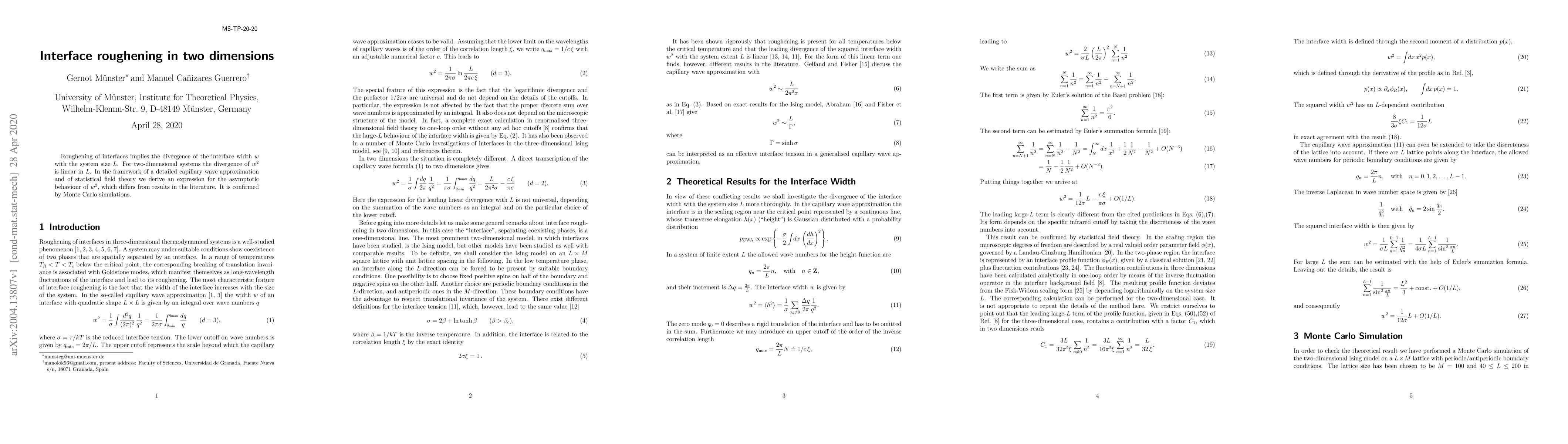 This paper derives a new expression for the asymptotic behavior of interface roughening in two-dimensional systems, showing that the divergence of $w^2$ is linear in $L$, differing from previous results. The findings are validated through Monte Carlo simulations.