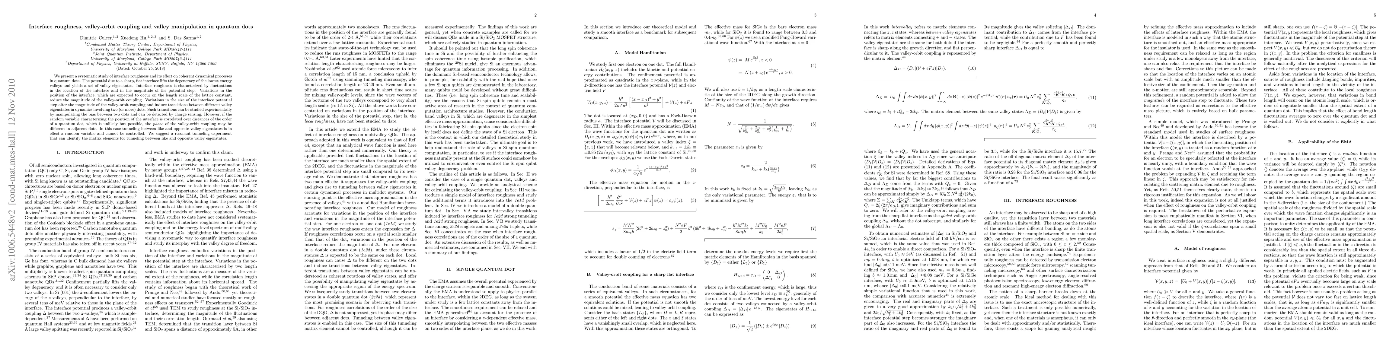 We present a systematic study of interface roughness and its effect on coherent dynamical processes in quantum dots. The potential due to a sharp, flat interface lifts the degeneracy of the lowest energy valleys and yields a set of valley eigenstates. Interface roughness is characterized by fluctuations in the location of the interface and in the magnitude of the potential step. Variations in the position of the interface, which are expected to occur on the length scale of the lattice constant, reduce the magnitude of the valley-orbit coupling. Variations in the size of the interface potential step alter the magnitude of the valley-orbit coupling and induce transitions between different valley eigenstates in dynamics involving two (or more) dots. Such transitions can be studied experimentally by manipulating the bias between two dots and can be detected by charge sensing. However, if the random variable characterizing the position of the interface is correlated over distances of the order of a quantum dot, which is unlikely but possible, the phase of the valley-orbit coupling may be different in adjacent dots. In this case tunneling between like and opposite valley eigenstates is in effect a random variable and cannot be controlled. We suggest a resonant tunneling experiment that can identify the matrix elements for tunneling between like and opposite valley eigenstates.