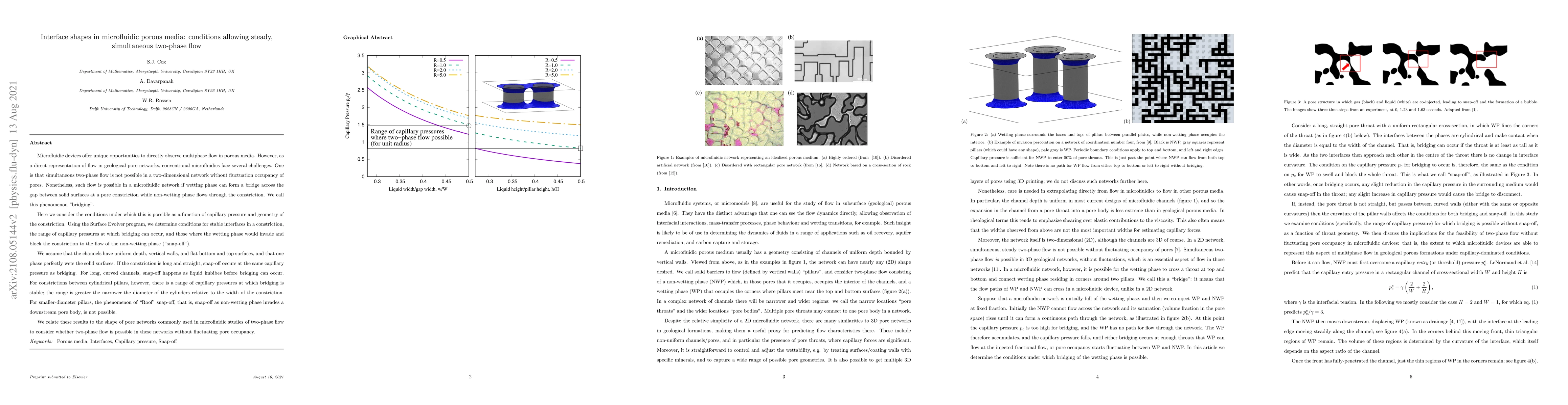 Microfluidic devices offer unique opportunities to directly observe multiphase flow in porous media. However, as a direct representation of flow in geological pore networks, conventional microfluidics face several challenges. One is that simultaneous two-phase flow is not possible in a 2D network without fluctuation occupancy of pores. Nonetheless, such flow is possible in a microfluidic network if wetting phase can form a bridge across the gap between solid surfaces at a pore constriction while non-wetting phase flows through the constriction. We call this phenomenon "bridging". Here we consider the conditions under which this is possible as a function of capillary pressure and geometry of the constriction. Using the Surface Evolver program, we determine conditions for stable interfaces in a constriction, the range of capillary pressures at which bridging can occur, and those where the wetting phase would invade and block the constriction to the flow of the non-wetting phase ("snap-off"). We assume that the channels have uniform depth, vertical walls, and flat bottom and top surfaces, and that one phase perfectly wets the solid surfaces. If the constriction is long and straight, snap-off occurs at the same capillary pressure as bridging. For long, curved channels, snap-off happens as liquid imbibes before bridging can occur. For constrictions between cylindrical pillars, however, there is a range of capillary pressures at which bridging is stable; the range is greater the narrower the diameter of the cylinders relative to the width of the constriction. For smaller-diameter pillars, snap-off as non-wetting phase invades a downstream pore body is not possible. We relate these results to the shape of pore networks commonly used in microfluidic studies of two-phase flow to consider whether two-phase flow is possible in these networks without fluctuating pore occupancy.
