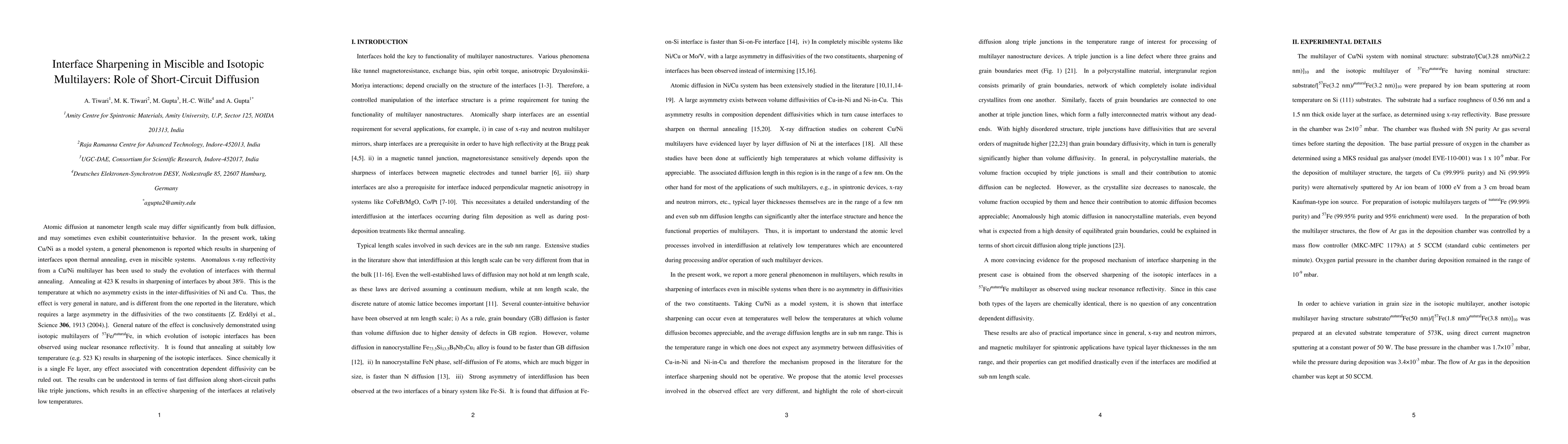 This study reports the unexpected sharpening of interfaces in miscible Cu/Ni and isotopic 57Fe/naturalFe multilayers upon thermal annealing, driven by short-circuit diffusion along triple junctions rather than bulk diffusion. This effect occurs at temperatures where no significant inter-diffusivity asymmetry exists, differing from previously reported phenomena requiring such asymmetry.