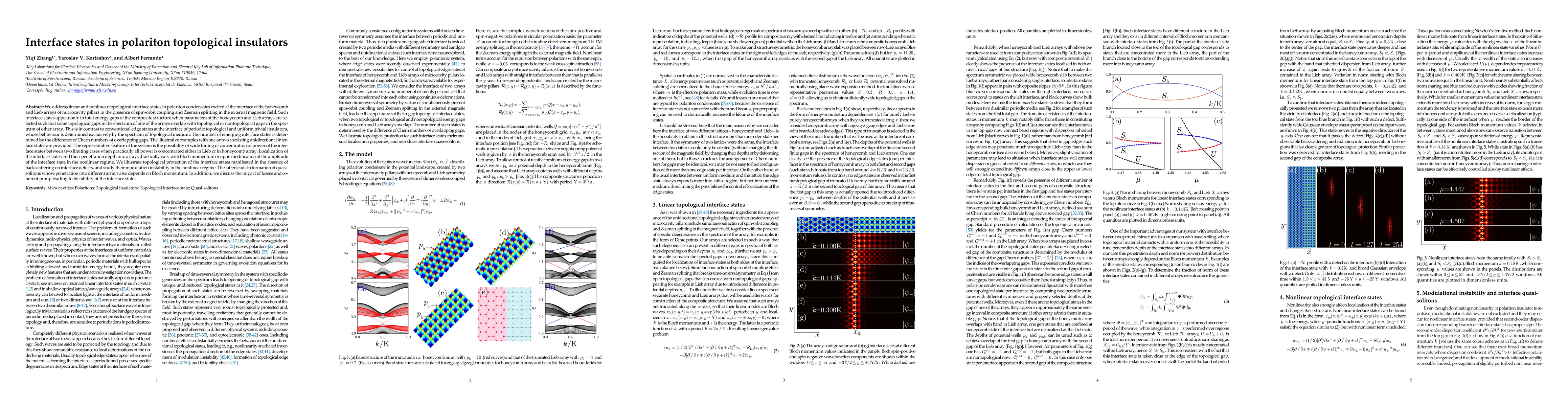This paper investigates topological interface states in polariton condensates at the interface of honeycomb and Lieb arrays of microcavity pillars, revealing their dependence on spin-orbit coupling and magnetic fields. The study highlights the tunable concentration and localization of these interface states, their topological protection, and their modulation instability leading to quasisoliton formation.