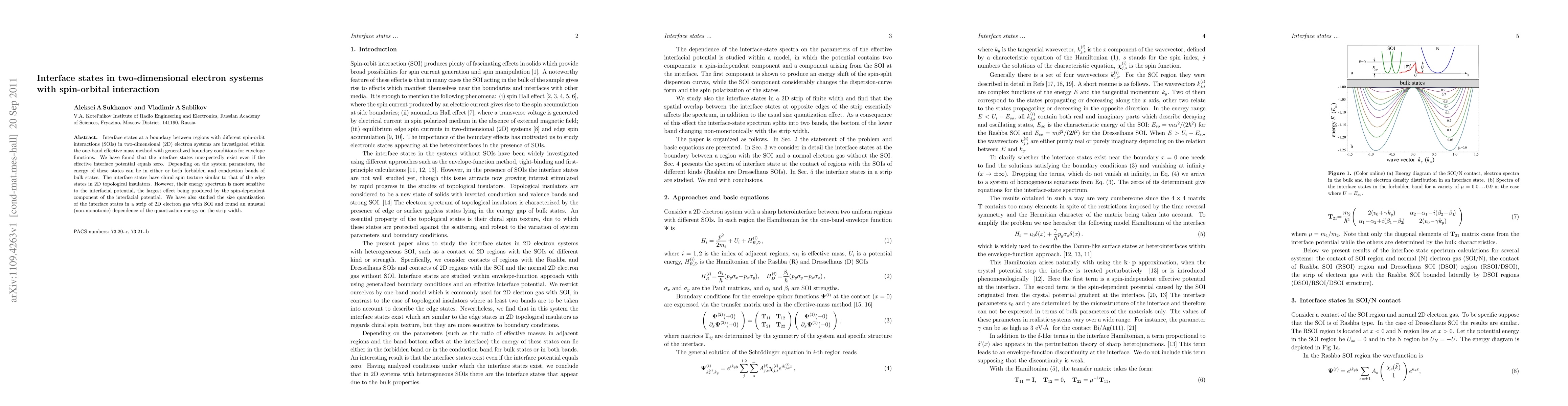 This paper investigates interface states in 2D electron systems with spin-orbital interaction, revealing their existence even when the effective interface potential is zero. The interface states exhibit chiral spin texture and are sensitive to the spin-dependent component of the interfacial potential, with a non-monotonic size quantization dependence on the strip width.