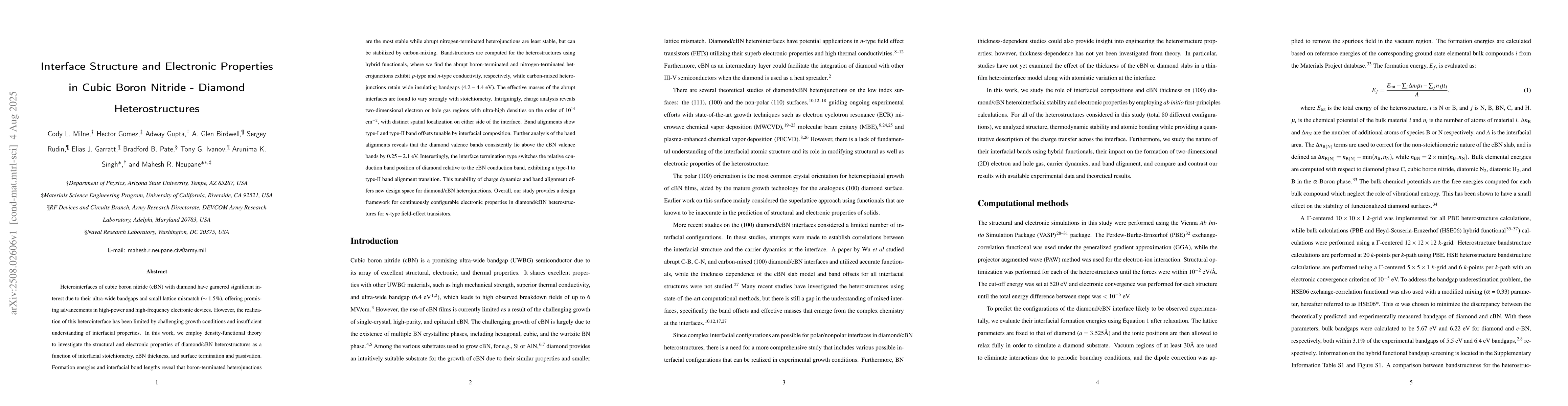 Heterointerfaces of cubic boron nitride (cBN) with diamond have garnered significant interest due to their ultra-wide bandgaps and small lattice mismatch ($\sim1.5$\%), offering promising advancements in high-power and high-frequency electronic devices. However, the realization of this heterointerface has been limited by challenging growth conditions and insufficient understanding of interfacial properties. In this work, we employ density-functional theory to investigate the structural and electronic properties of diamond/cBN heterostructures as a function of interfacial stoichiometry, cBN thickness, and surface termination and passivation. Formation energies and interfacial bond lengths reveal that boron-terminated heterojunctions are the most stable while abrupt nitrogen-terminated heterojunctions are least stable, but can be stabilized by carbon-mixing. Bandstructures are computed for the heterostructures using hybrid functionals, where we find the abrupt boron-terminated and nitrogen-terminated heterojunctions exhibit $p$-type and $n$-type conductivity, respectively, while carbon-mixed heterojunctions retain wide insulating bandgaps ($4.2-4.4$ eV). The effective masses of the abrupt interfaces are found to vary strongly with stoichiometry. Intriguingly, charge analysis reveals two-dimensional electron or hole gas regions with ultra-high densities on the order of $10^{14}$ cm$^{-2}$, with distinct spatial localization on either side of the interface. Band alignments show type-I and type-II band offsets tunable by interfacial composition. Further analysis of the band alignments reveals that the diamond valence bands consistently lie above the cBN valence bands by $0.25-2.1$ eV. Interestingly, the interface termination type switches the relative conduction band position of diamond relative to the cBN conduction band, exhibiting a type-I to type-II band alignment transition.