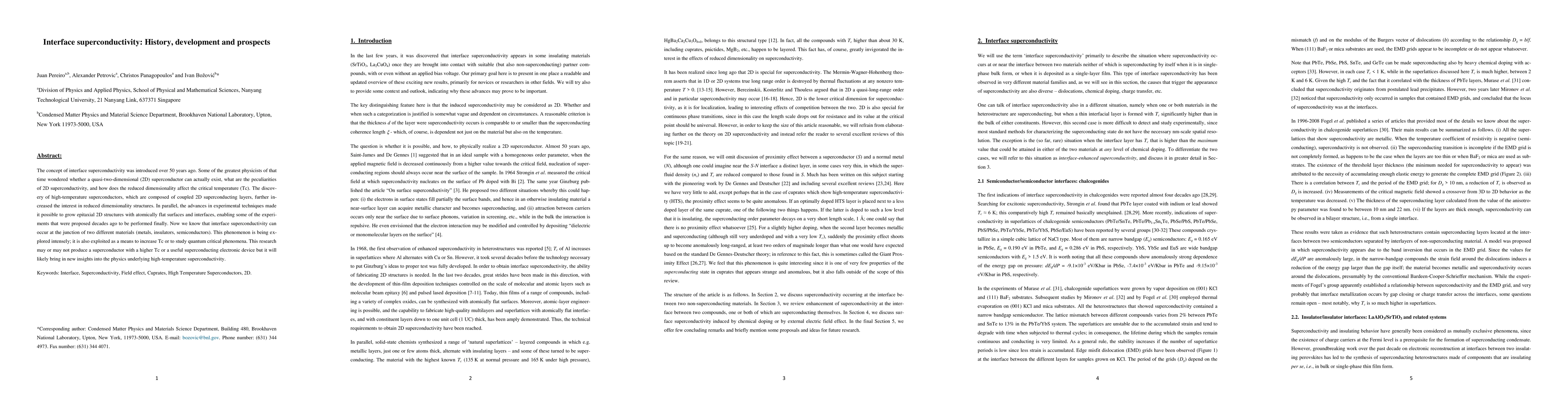 The concept of interface superconductivity was introduced over 50 years ago. Some of the greatest physicists of that time wondered whether a quasi-two-dimensional (2D) superconductor can actually exist, what are the peculiarities of 2D superconductivity, and how does the reduced dimensionality affect the critical temperature (Tc). The discovery of high-temperature superconductors, which are composed of coupled 2D superconducting layers, further increased the interest in reduced dimensionality structures. In parallel, the advances in experimental techniques made it possible to grow epitaxial 2D structures with atomically flat surfaces and interfaces, enabling some of the experiments that were proposed decades ago to be performed finally. Now we know that interface superconductivity can occur at the junction of two different materials (metals, insulators, semiconductors). This phenomenon is being explored intensely; it is also exploited as a means to increase Tc or to study quantum critical phenomena. This research may or may not produce a superconductor with a higher Tc or a useful superconducting electronic device but it will likely bring in new insights into the physics underlying high-temperature superconductivity.