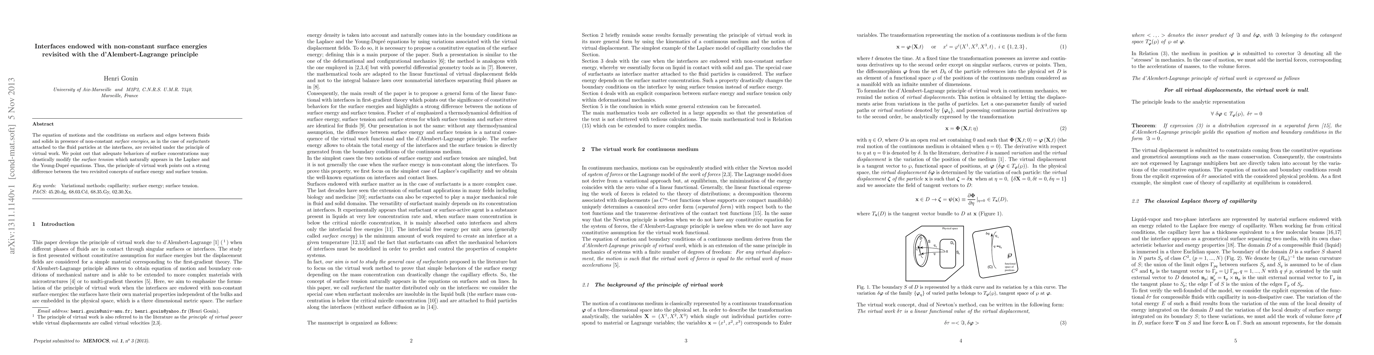 The equation of motions and the conditions on surfaces and edges between fluids and solids in presence of non-constant surface energies, as in the case of surfactants attached to the fluid particles at the interfaces, are revisited under the principle of virtual work. We point out that adequate behaviors of surface concentrations may drastically modify the surface tension which naturally appears in the Laplace and the Young-Dupr\'e equations. Thus, the principle of virtual work points out a strong difference between the two revisited concepts of surface energy and surface tension.