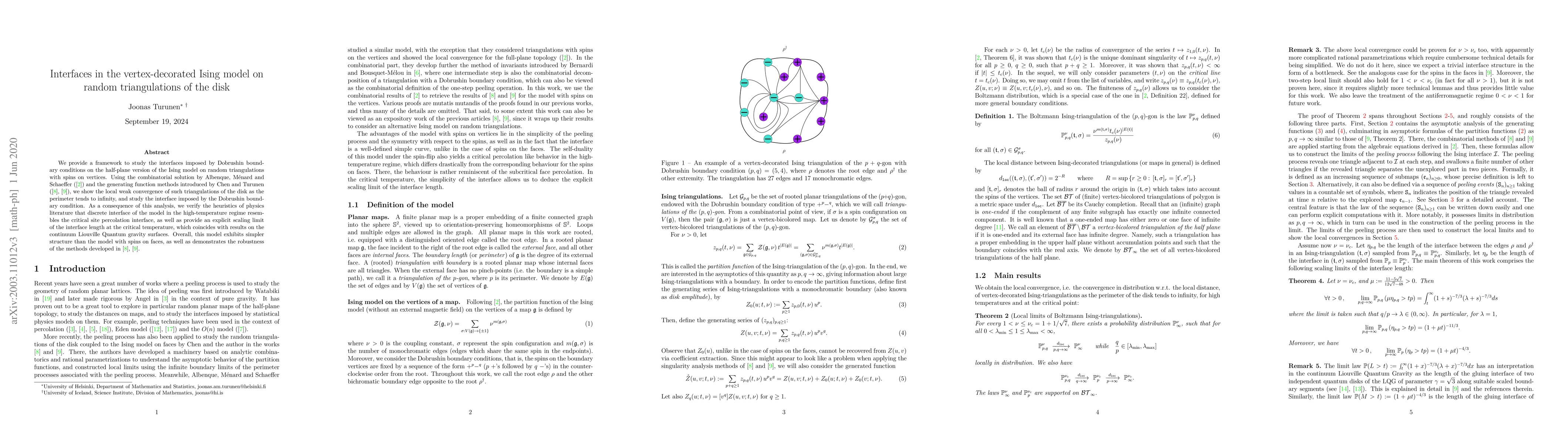 This paper studies the interfaces in the Ising model on random triangulations of the disk with Dobrushin boundary conditions, showing that they resemble the critical site percolation interface and providing a scaling limit for the interface length at critical temperature.