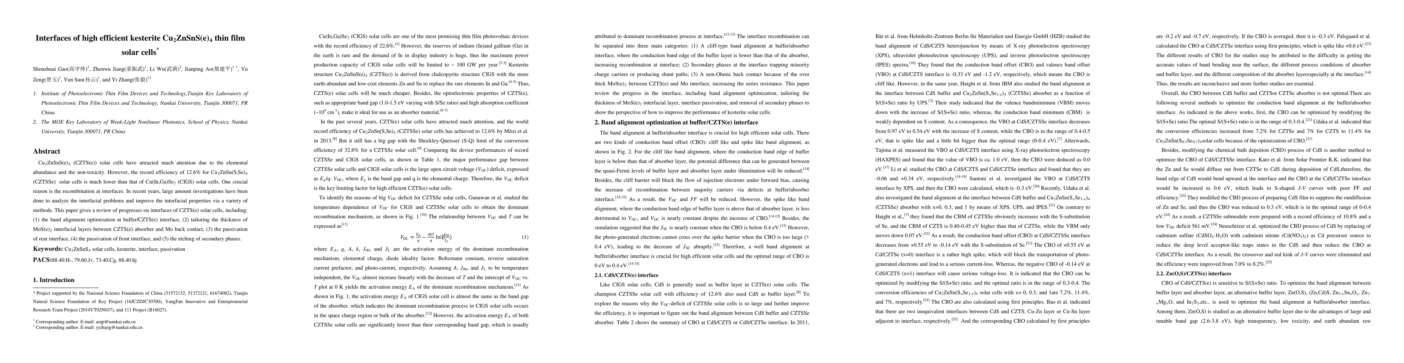 Cu2ZnSnS(e)4 (CZTS(e)) solar cells have attracted much attention due to the elemental abundance and the non-toxicity. However, the record efficiency of 12.6% for Cu2ZnSn(S,Se)4 (CZTSSe) solar cells is much lower than that of Cu(In,Ga)Se2 (CIGS) solar cells. One crucial reason is the recombination at interfaces. In recent years, large amount investigations have been done to analyze the interfacial problems and improve the interfacial properties via a variety of methods. This paper gives a review of progresses on interfaces of CZTS(e) solar cells, including: (1) the band alignment optimization at buffer/CZTS(e) interface, (2) tailoring the thickness of MoS(e)2 interfacial layers between CZTS(e) absorber and Mo back contact, (3) the passivation of rear interface, (4) the passivation of front interface, and (5) the etching of secondary phases.