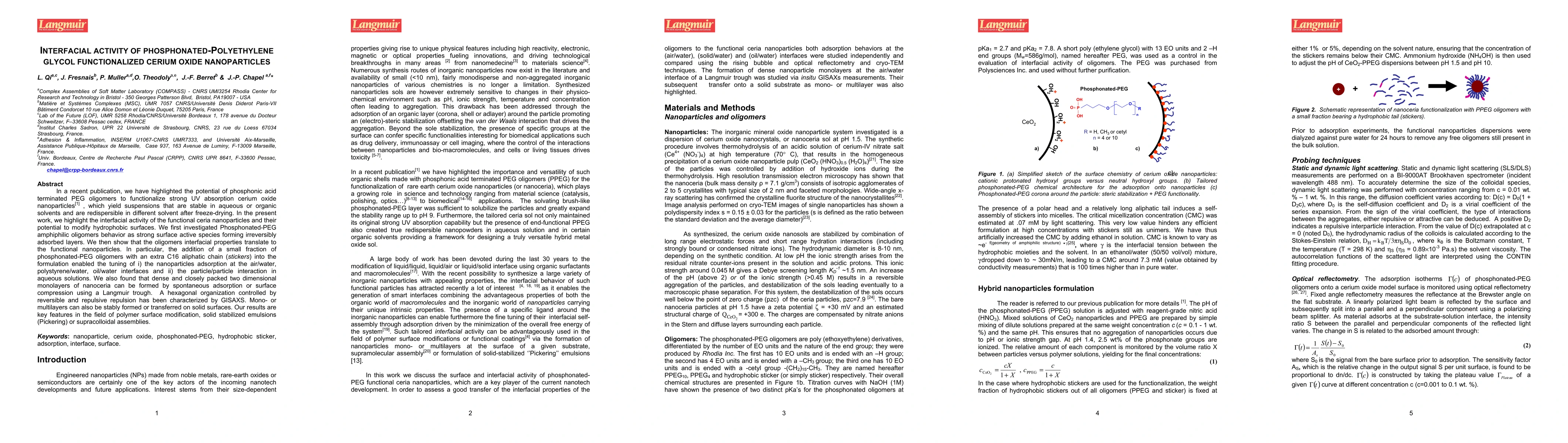 This paper investigates the interfacial activity of phosphonated-PEG functionalized cerium oxide nanoparticles, demonstrating their ability to modify hydrophobic surfaces and form stable monolayers or multilayers at various interfaces. The study highlights the use of phosphonated-PEG oligomers to tune nanoparticle adsorption and interactions, with potential applications in surface modification and emulsion stabilization.